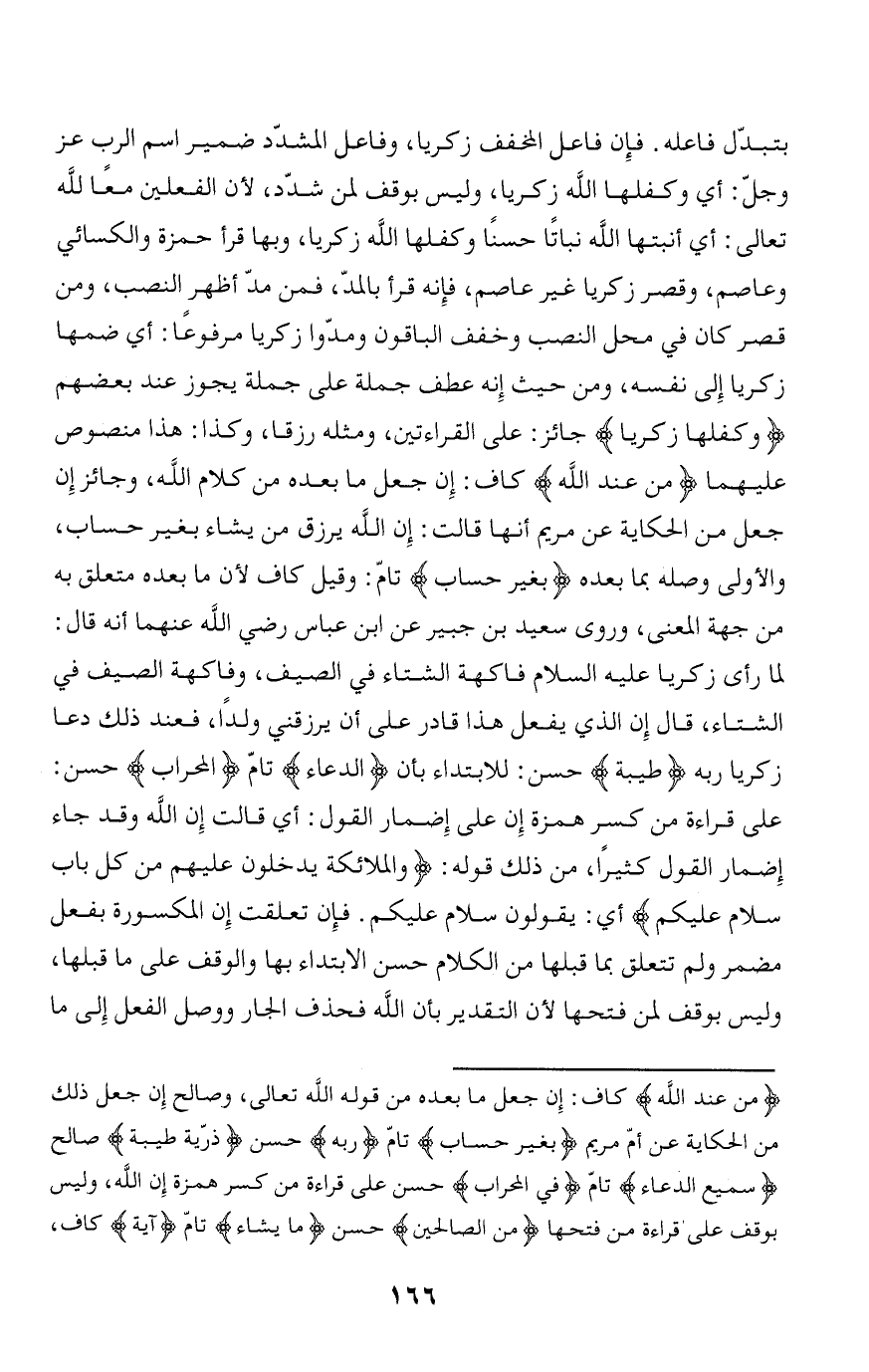 بتبدّل فاعله. فإن فاعل المخفف زكريا، وفاعل المشدّد ضمير اسم الرب عز وجلّ: أي وكفلها الله زكريا، وليس بوقف لمن شدّد، لأن الفعلين معا لله تعالى: أي أنبتها الله نباتا حسنا وكفلها الله زكريا، وبها قرأ حمزة والكسائي وعاصم، وقصر زكريا غير عاصم، فإنه قرأ بالمدّ، فمن مدّ أظهر النصب، ومن قصر كان في محل النصب وخفف الباقون ومدّوا زكريا مرفوعا: أي ضمها زكريا إلى نفسه، ومن حيث إنه عطف جملة على جملة يجوز عند بعضهم وَكَفَّلَها زَكَرِيَّا جائز: على القراءتين، ومثله رزقا، وكذا: هذا منصوص عليهما مِنْ عِنْدِ اللَّهِ كاف: إن جعل ما بعده من كلام الله، وجائز إن جعل من الحكاية عن مريم أنها قالت: إن الله يرزق من يشاء بغير حساب، والأولى وصله بما بعده بِغَيْرِ حِسابٍ تامّ: وقيل كاف لأن ما بعده متعلق به من جهة المعنى، وروى سعيد بن جبير عن ابن عباس رضي الله عنهما أنه قال: