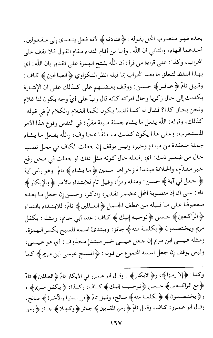 أحدهما الهاء، والثاني أن الله. وأما من أقام النداء مقام القول فلا يقف على المحراب، وكذا: على قراءة من قرأ: أن الله بفتح الهمزة على تقدير بأن الله: أي بهذا اللفظ لتعلق ما بعد المحراب بما قبله انظر النكزاوي الصَّالِحِينَ كاف:
