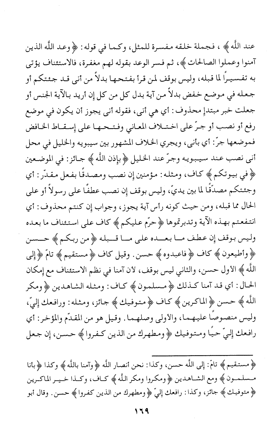 عِنْدَ اللَّهِ، فجملة خلقه مفسرة للمثل، وكما في قوله: وَعَدَ اللَّهُ الَّذِينَ آمَنُوا وَعَمِلُوا الصَّالِحاتِ، ثم فسر الوعد بقوله لَهُمْ مَغْفِرَةٌ، فالاستئناف يؤتى به تفسيرا لما قبله، وليس بوقف لمن قرأ بفتحها بدلا من أنى قد جئتكم أو جعله في موضع خفض بدلا من آية بدل كل من كل إن أريد بالآية الجنس أو جعلت خبر مبتدإ محذوف: أي هي أنى، فقوله أنى يجوز أن يكون في موضع رفع أو نصب أو جرّ على اختلاف المعاني وفتحها على إسقاط الخافض فموضعها جرّ: أي بأنى، ويجري الخلاف المشهور بين سيبويه والخليل في محل أنى نصب عند سيبويه وجرّ عند الخليل بِإِذْنِ اللَّهِ جائز: في الموضعين فِي بُيُوتِكُمْ كاف، ومثله: مؤمنين إن نصب ومصدقا بفعل مقدّر: أي وجئتكم مصدّقا لما بين يديّ، وليس بوقف إن نصب عطفا على رسولا أو على الحال مما قبله، ومن حيث كونه رأس آية يجوز، وجواب إن كنتم محذوف: أي انتفعتم بهذه الآية وتدبرتموها حُرِّمَ عَلَيْكُمْ كاف على استئناف ما بعده وليس بوقف إن عطف ما بعده على ما قبله مِنْ رَبِّكُمْ حسن وَأَطِيعُونِ كاف فَاعْبُدُوهُ حسن. وقيل كاف مُسْتَقِيمٌ تامّ إِلَى اللَّهِ الأول حسن، والثاني ليس بوقف، لأن آمنا في نظم الاستئناف مع إمكان الحال: أي قد آمنا كذلك مُسْلِمُونَ كاف: ومثله الشاهدين وَمَكَرَ اللَّهُ حسن الْماكِرِينَ كاف مُتَوَفِّيكَ جائز، ومثله: ورافعك إليّ، وليس منصوصا عليهما، والأولى وصلهما. وقيل هو من المقدّم والمؤخر: أي رافعك إليّ حيا ومتوفيك وَمُطَهِّرُكَ مِنَ الَّذِينَ كَفَرُوا حسن، إن جعل