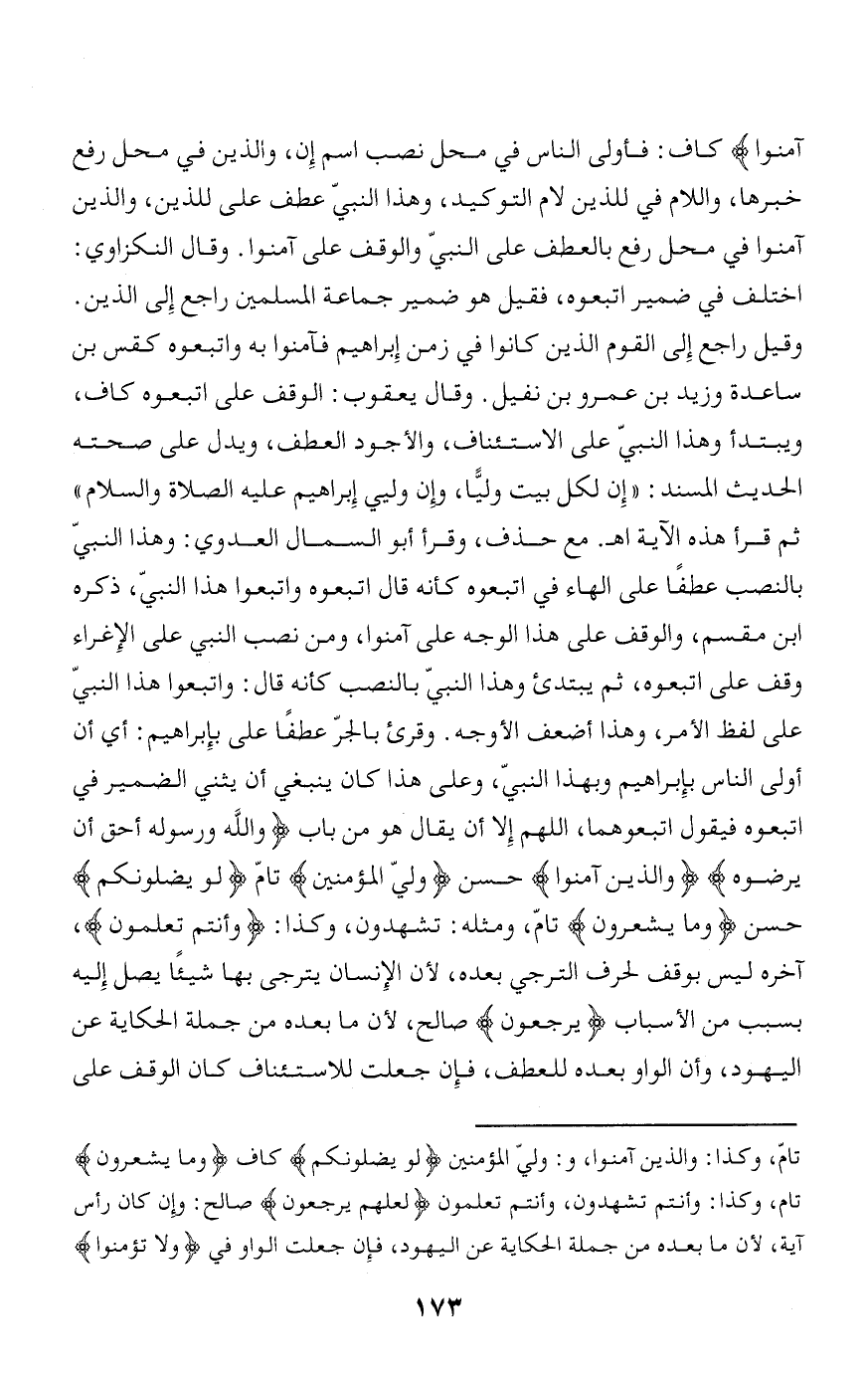 آمَنُوا كاف: فأولى الناس في محل نصب اسم إن، والذين في محل رفع خبرها، واللام في للذين لام التوكيد، وهذا النبيّ عطف على للذين، والذين آمنوا في محل رفع بالعطف على النبيّ والوقف على آمنوا. وقال النكزاوي: