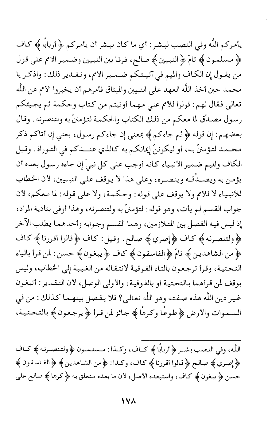 لتؤمننّ به ولتنصرنه، وهذا أوفى بتأدية المراد، إذ ليس فيه الفصل بين المتلازمين، وهما القسم وجوابه وأحدهما يطلب الآخر وَلَتَنْصُرُنَّهُ كاف إِصْرِي صالح. وقيل: كاف قالُوا أَقْرَرْنا كاف مِنَ الشَّاهِدِينَ تامّ الْفاسِقُونَ كاف يَبْغُونَ حسن: لمن قرأ بالياء التحتية، وقرأ ترجعون بالتاء الفوقية لانتقاله من الغيبة إلى الخطاب، وليس بوقف لمن قرأهما بالتحتية أو بالفوقية، والأولى الوصل، لأن التقدير: أتبغون غير دين الله هذه صفته وهو الله تعالى؟ فلا يفصل بينهما كذلك: من في السموات والأرض طَوْعاً وَكَرْهاً جائز لمن قرأ يُرْجَعُونَ بالتحتية،