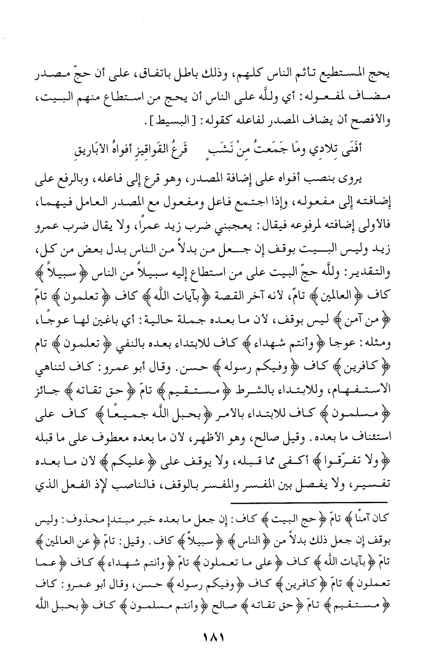 لمرفوعه فيقال: يعجبني ضرب زيد عمرا، ولا يقال ضرب عمرو زيد وليس البيت بوقف إن جعل من بدلا من الناس بدل بعض من كل، والتقدير: ولله حجّ البيت على من استطاع إليه سبيلا من الناس سَبِيلًا كاف الْعالَمِينَ تامّ، لأنه آخر القصة بِآياتِ اللَّهِ كاف تَعْمَلُونَ تامّ مَنْ آمَنَ ليس بوقف، لأن ما بعده جملة حالية: أي باغين لها عوجا، ومثله: عوجا وَأَنْتُمْ شُهَداءُ كاف للابتداء بعده بالنفي تَعْمَلُونَ تام كافِرِينَ كاف وَفِيكُمْ رَسُولُهُ حسن. وقال أبو عمرو: كاف لتناهي الاستفهام، وللابتداء بالشرط مُسْتَقِيمٍ تامّ حَقَّ تُقاتِهِ جائز مُسْلِمُونَ كاف للابتداء بالأمر بِحَبْلِ اللَّهِ جَمِيعاً كاف على استئناف ما بعده. وقيل صالح، وهو الأظهر، لأن ما بعده معطوف على ما قبله وَلا تَفَرَّقُوا أكفى مما قبله، ولا يوقف على عَلَيْكُمْ لأن ما بعده تفسير، ولا يفصل بين المفسر والمفسر بالوقف، فالناصب لإذ الفعل الذي