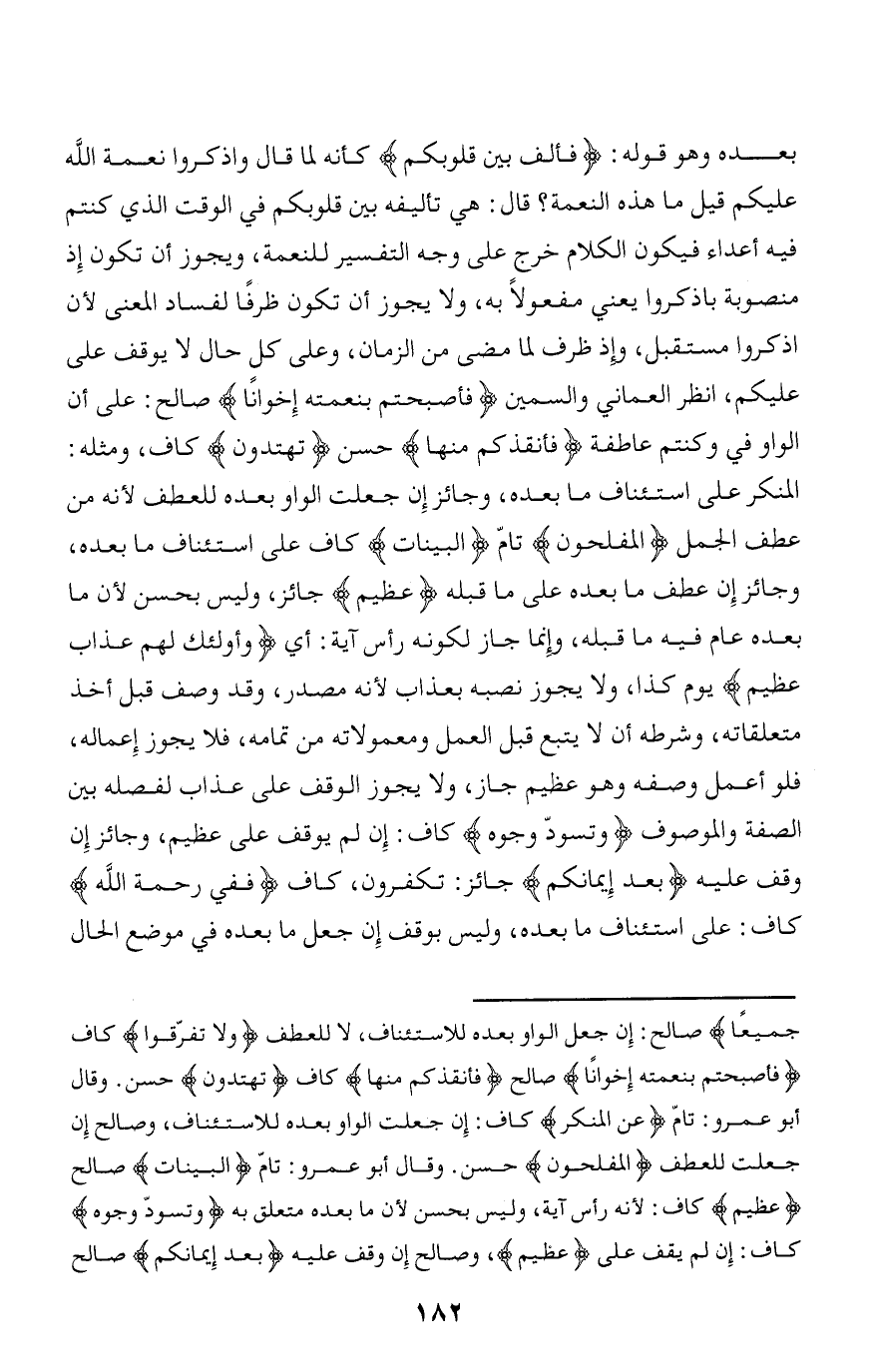 جَمِيعاً صالح: إن جعل الواو بعده للاستئناف، لا للعطف وَلا تَفَرَّقُوا كاف فَأَصْبَحْتُمْ بِنِعْمَتِهِ إِخْواناً صالح فَأَنْقَذَكُمْ مِنْها كاف تَهْتَدُونَ حسن. وقال أبو عمرو: تامّ عَنِ الْمُنْكَرِ كاف: إن جعلت الواو بعده للاستئناف، وصالح إن جعلت للعطف الْمُفْلِحُونَ حسن. وقال أبو عمرو: تامّ الْبَيِّناتُ صالح عَظِيمٌ كاف: لأنه رأس آية، وليس بحسن لأن ما بعده متعلق به وَتَسْوَدُّ وُجُوهٌ كاف: إن لم يقف على عَظِيمٌ، وصالح إن وقف عليه بَعْدَ إِيمانِكُمْ صالح
