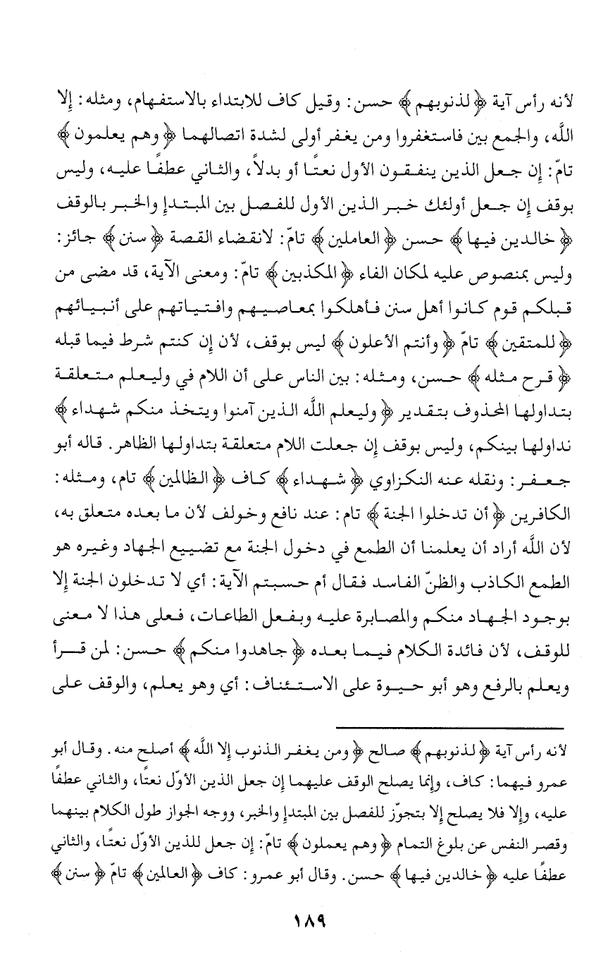 لأنه رأس آية لِذُنُوبِهِمْ حسن: وقيل كاف للابتداء بالاستفهام، ومثله: إلا الله، والجمع بين فاستغفروا ومن يغفر أولى لشدة اتصالهما وَهُمْ يَعْلَمُونَ تامّ: إن جعل الذين ينفقون الأول نعتا أو بدلا، والثاني عطفا عليه، وليس بوقف إن جعل أولئك خبر الذين الأول للفصل بين المبتدإ والخبر بالوقف خالِدِينَ فِيها حسن الْعامِلِينَ تامّ: لانقضاء القصة سُنَنٌ جائز:
