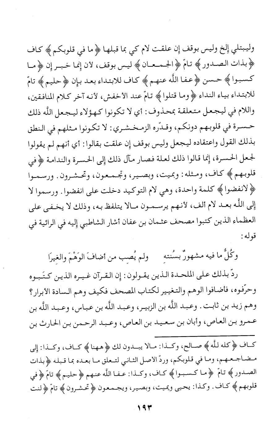 وليبتلي إلخ وليس بوقف إن علقت لام كي بما قبلها ما فِي قُلُوبِكُمْ كاف بِذاتِ الصُّدُورِ تامّ الْجَمْعانِ ليس بوقف، لأن إنما خبر إن ما كَسَبُوا حسن عَفَا اللَّهُ عَنْهُمْ كاف للابتداء بعد بإن حَلِيمٌ تامّ للابتداء بياء النداء وَما قُتِلُوا تامّ عند الأخفش، لأنه آخر كلام المنافقين، واللام في ليجعل متعلقة بمحذوف: أي لا تكونوا كهؤلاء ليجعل الله ذلك حسرة في قلوبهم دونكم، وقدّره الزمخشري: لا تكونوا مثلهم في النطق بذلك القول واعتقاده ليجعل وليس بوقف إن علقت بقالوا: أي أنهم لم يقولوا لجعل الحسرة، إنما قالوا ذلك لعلة فصار مآل ذلك إلى الحسرة والندامة فِي قُلُوبِهِمْ كاف، ومثله: وبميت، وبصير، وتجمعون، وتحشرون. ورسموا لَانْفَضُّوا كلمة واحدة، وهي لام التوكيد دخلت على انفضوا. ورسموا لا إلى الله بعد لام ألف، لأنهم يرسمون ما لا يتلفظ به، وذلك لا يخفى على العظماء الذين كتبوا مصحف عثمان بن عفان أشار الشاطبي إليه في الرائية في قوله: