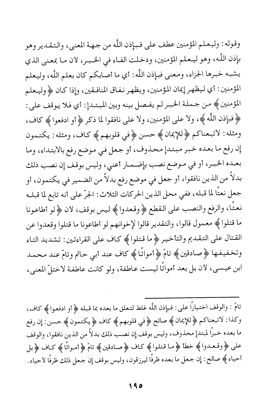فَبِإِذْنِ اللَّهِ، ولا على المؤمنين، ولا على نافقوا لما ذكر أَوِ ادْفَعُوا كاف، ومثله: لاتبعناكم لِلْإِيمانِ حسن فِي قُلُوبِهِمْ كاف، ومثله: يكتمون إن رفع ما بعده خبر مبتدإ محذوف، أو جعل في موضع رفع بالابتداء، وما بعده الخبر، أو في موضع نصب بإضمار أعني، وليس بوقف إن نصب ذلك بدلا من الذين نافقوا، أو جعل في موضع رفع بدلا