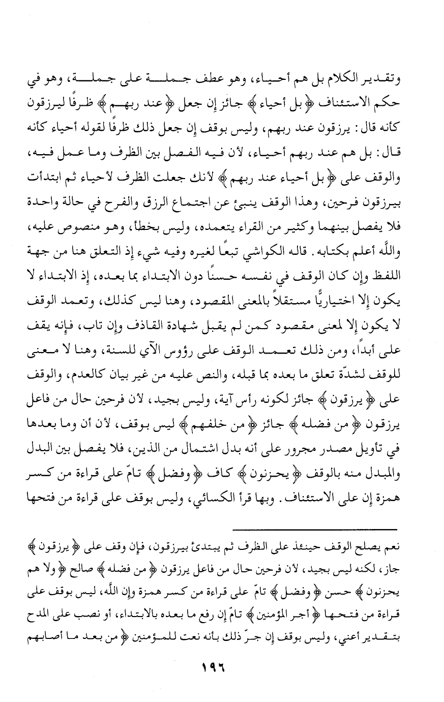 وتقدير الكلام بل هم أحياء، وهو عطف جملة على جملة، وهو في حكم الاستئناف بَلْ أَحْياءٌ جائز إن جعل عِنْدَ رَبِّهِمْ ظرفا ليرزقون كأنه قال: يرزقون عند ربهم، وليس بوقف إن جعل ذلك ظرفا لقوله أحياء كأنه قال: بل هم عند ربهم أحياء، لأن فيه الفصل بين الظرف وما عمل فيه، والوقف على بَلْ أَحْياءٌ عِنْدَ رَبِّهِمْ لأنك جعلت الظرف لأحياء ثم ابتدأت بيرزقون فرحين، وهذا الوقف ينبئ عن اجتماع الرزق والفرح في حالة واحدة فلا يفصل بينهما وكثير من القراء يتعمده، وليس بخطإ، وهو منصوص عليه، والله أعلم بكتابه. قاله الكواشي تبعا لغيره وفيه شيء إذ التعلق هنا من جهة اللفظ وإن كان الوقف في نفسه حسنا دون الابتداء بما بعده، إذ الابتداء لا يكون إلا اختياريّا مستقلا بالمعنى المقصود، وهنا ليس كذلك، وتعمد الوقف لا يكون إلا لمعنى مقصود كمن لم يقبل شهادة القاذف وإن تاب، فإنه يقف على أبدا، ومن ذلك تعمد الوقف على رءوس الآي للسنة، وهنا لا معنى للوقف لشدّة تعلق ما بعده بما قبله، والنص عليه من غير بيان كالعدم، والوقف على يُرْزَقُونَ جائز لكونه رأس آية، وليس بجيد، لأن فرحين حال من فاعل يرزقون مِنْ فَضْلِهِ جائز مِنْ خَلْفِهِمْ ليس بوقف، لأن أن وما بعدها في تأويل مصدر مجرور على أنه بدل اشتمال من الذين، فلا يفصل بين البدل والمبدل منه بالوقف يَحْزَنُونَ كاف وَفَضْلٍ تامّ على قراءة من كسر همزة إن على الاستئناف. وبها قرأ الكسائي، وليس بوقف على قراءة من فتحها