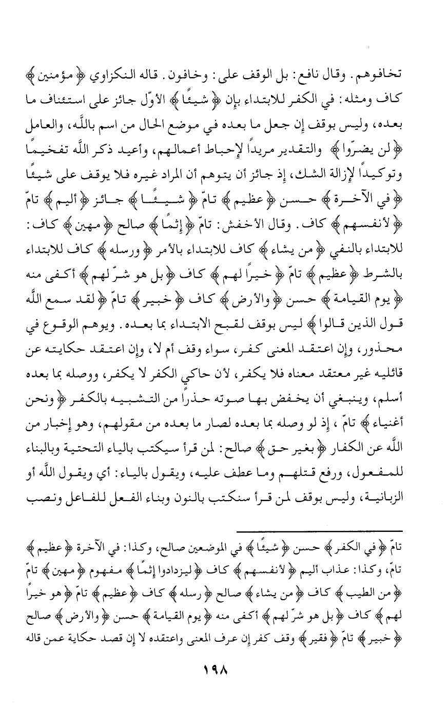 تخافوهم. وقال نافع: بل الوقف على: وخافون. قاله النكزاوي مُؤْمِنِينَ كاف ومثله: في الكفر للابتداء بإن شَيْئاً الأوّل جائز على استئناف ما بعده، وليس بوقف إن جعل ما بعده في موضع الحال من اسم بالله، والعامل لَنْ يَضُرُّوا والتقدير مريدا لإحباط أعمالهم، وأعيد ذكر الله تفخيما وتوكيدا لإزالة الشك، إذ جائز أن يتوهم أن المراد غيره فلا يوقف على شيئا فِي الْآخِرَةِ حسن عَظِيمٌ تامّ شَيْئاً جائز أَلِيمٌ تامّ لِأَنْفُسِهِمْ كاف. وقال الأخفش: تامّ إِثْماً صالح مُهِينٌ كاف: