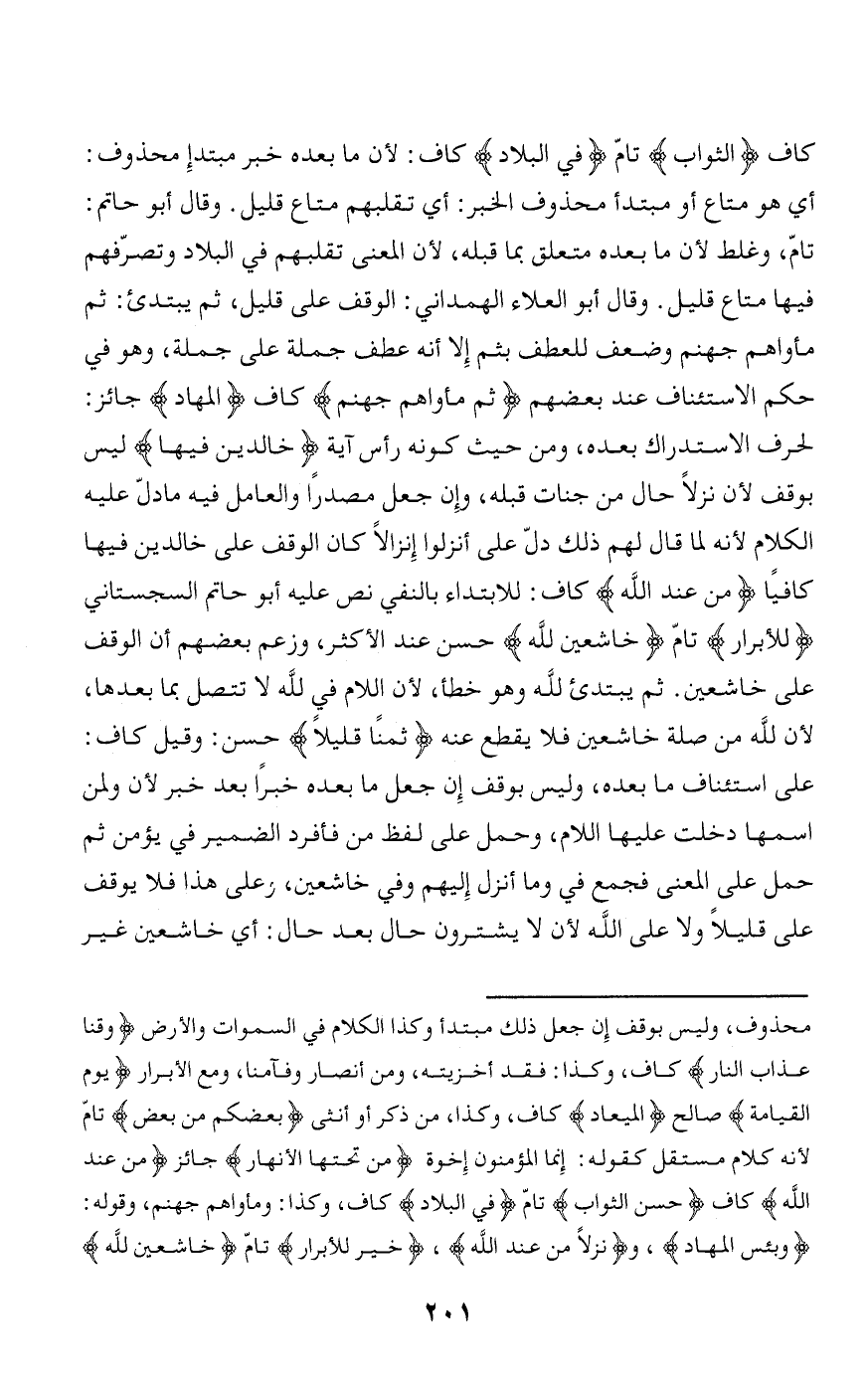 لحرف الاستدراك بعده، ومن حيث كونه رأس آية خالِدِينَ فِيها ليس بوقف لأن نزلا حال من جنات قبله، وإن جعل مصدرا والعامل فيه ما دلّ عليه الكلام لأنه لما قال لهم ذلك دلّ على أنزلوا إنزالا كان الوقف على خالدين فيها كافيا مِنْ عِنْدِ اللَّهِ كاف: للابتداء بالنفي نص عليه أبو حاتم السجستاني لِلْأَبْرارِ تامّ خاشِعِينَ لِلَّهِ حسن عند الأكثر، وزعم بعضهم أن الوقف على خاشعين. ثم يبتدئ لله وهو خطأ، لأن اللام في لله لا تتصل بما بعدها، لأن لله من صلة خاشعين فلا يقطع عنه ثَمَناً قَلِيلًا حسن: وقيل كاف: