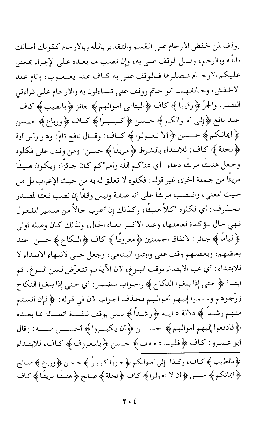 عند نافع إِلى أَمْوالِكُمْ حسن كَبِيراً كاف وَرُباعَ حسن أَيْمانُكُمْ حسن أَلَّا تَعُولُوا كاف: وقال نافع تامّ: وهو رأس آية نِحْلَةً كاف: للابتداء بالشرط مَرِيئاً حسن: ومن وقف على فكلوه وجعل هنيئا مريئا دعاء: أي هنأكم الله وأمرأكم كان جائزا، ويكون هنيئا مريئا من جملة أخرى غير قوله: فكلوه لا تعلق له به من حيث الإعراب بل من حيث المعنى، وانتصب مريئا على أنه صفة وليس وقفا إن نصب نعتا لمصدر محذوف: أي فكلوه أكلا هنيئا، وكذلك إن أعرب حالا من ضمير المفعول فهي حال مؤكدة لعاملها، وعند الأكثر معناه الحال، ولذلك كان وصله أولى قِياماً جائز: لاتفاق الجملتين مَعْرُوفاً كاف النِّكاحَ حسن: عند بعضهم، وبعضهم وقف على وابتلوا اليتامى، وجعل حتى لانتهاء الابتداء لا للابتداء: أي غيا الابتداء بوقت البلوغ، لأن الآية لم تتعرّض لسن البلوغ. ثم ابتدأ حَتَّى إِذا بَلَغُوا النِّكاحَ والجواب مضمر: أي حتى إذا بلغوا النكاح زوّجوهم وسلموا إليهم أموالهم فحذف الجواب لأن في قوله: فَإِنْ آنَسْتُمْ مِنْهُمْ رُشْداً دلالة عليه رُشْداً ليس بوقف لشدة اتصاله بما بعده فَادْفَعُوا إِلَيْهِمْ أَمْوالَهُمْ حسن أَنْ يَكْبَرُوا أحسن منه: وقال أبو عمرو: كاف فَلْيَسْتَعْفِفْ حسن بِالْمَعْرُوفِ كاف، للابتداء
