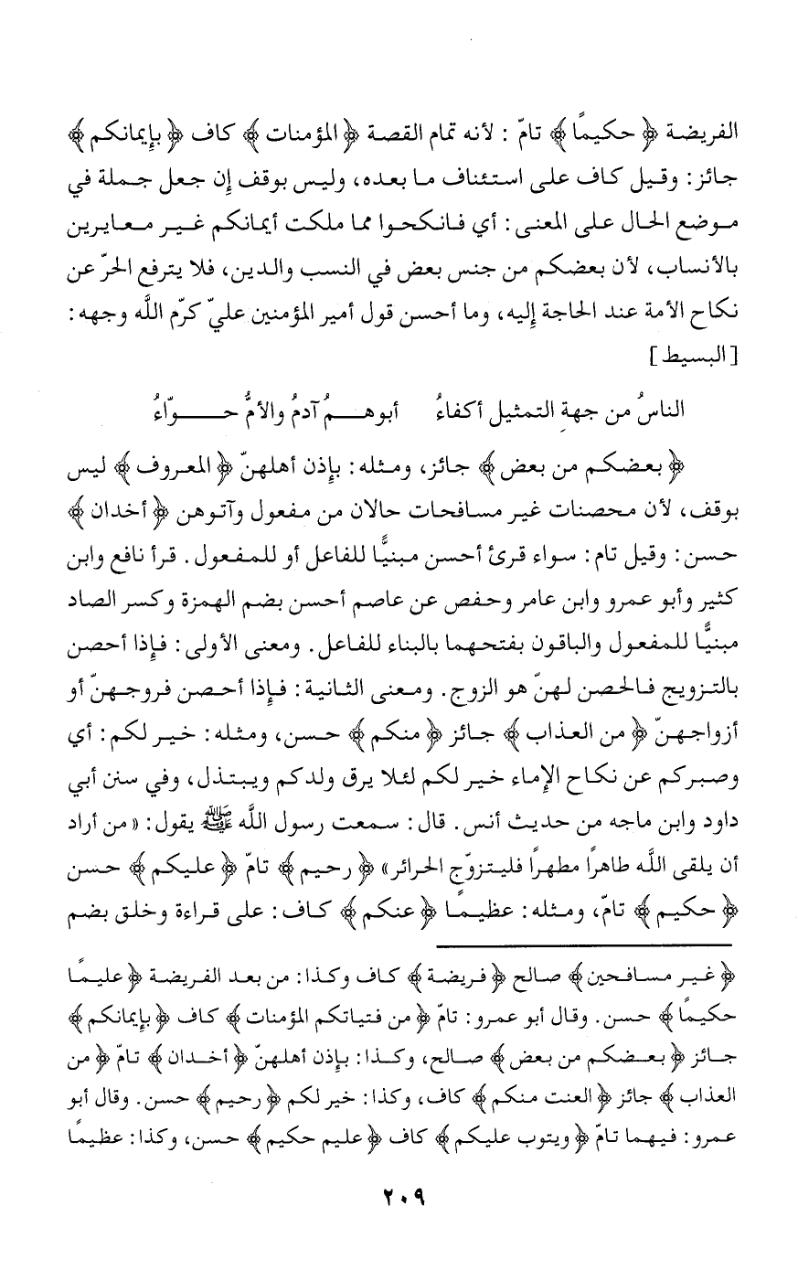الفريضة حَكِيماً تامّ: لأنه تمام القصة الْمُؤْمِناتِ كاف بِإِيمانِكُمْ جائز: وقيل كاف على استئناف ما بعده، وليس بوقف إن جعل جملة في موضع الحال على المعنى: أي فانكحوا مما ملكت أيمانكم غير معايرين بالأنساب، لأن بعضكم من جنس بعض في النسب والدين، فلا يترفع الحرّ عن نكاح الأمة عند الحاجة إليه، وما أحسن قول أمير المؤمنين عليّ كرّم الله وجهه: