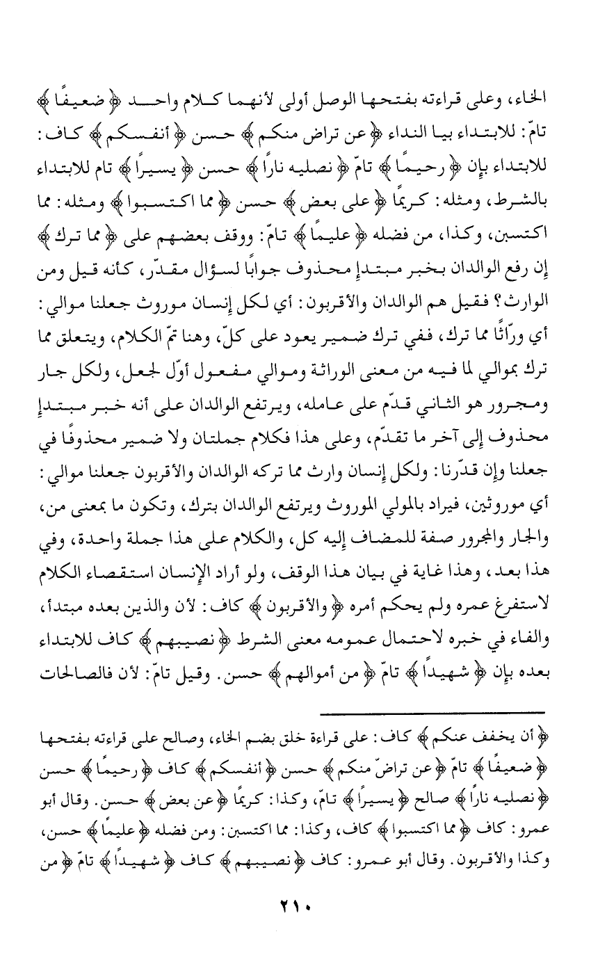 أَنْ يُخَفِّفَ عَنْكُمْ كاف: على قراءة خلق بضم الخاء، وصالح على قراءته بفتحها ضَعِيفاً تامّ عَنْ تَراضٍ مِنْكُمْ حسن أَنْفُسَكُمْ كاف رَحِيماً حسن نُصْلِيهِ ناراً صالح يَسِيراً تامّ، وكذا: كريما عَلى بَعْضٍ حسن. وقال أبو عمرو: كاف مِمَّا اكْتَسَبُوا كاف، وكذا: مما اكتسبن: ومن فضله عَلِيماً حسن، وكذا والأقربون. وقال أبو عمرو: كاف نَصِيبَهُمْ كاف شَهِيداً تامّ مِنْ