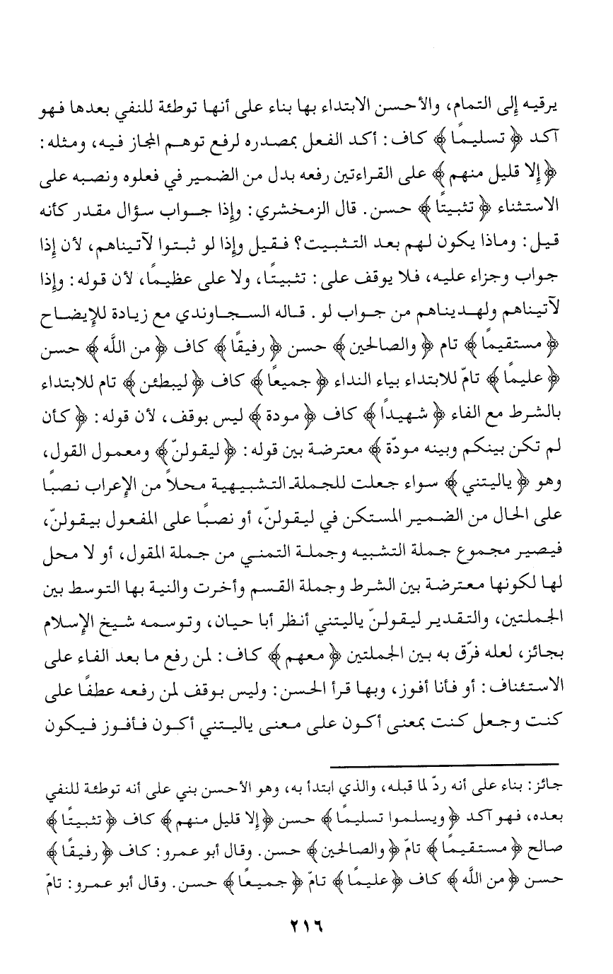 جائز: بناء على أنه ردّ لما قبله، والذي ابتدأ به، وهو الأحسن بني على أنه توطئة للنفي بعده، فهو آكد وَيُسَلِّمُوا تَسْلِيماً حسن إِلَّا قَلِيلٌ مِنْهُمْ كاف تَثْبِيتاً صالح مُسْتَقِيماً تامّ وَالصَّالِحِينَ حسن. وقال أبو عمرو: كاف رَفِيقاً حسن مِنَ اللَّهِ كاف عَلِيماً تامّ جَمِيعاً حسن. وقال أبو عمرو: تامّ