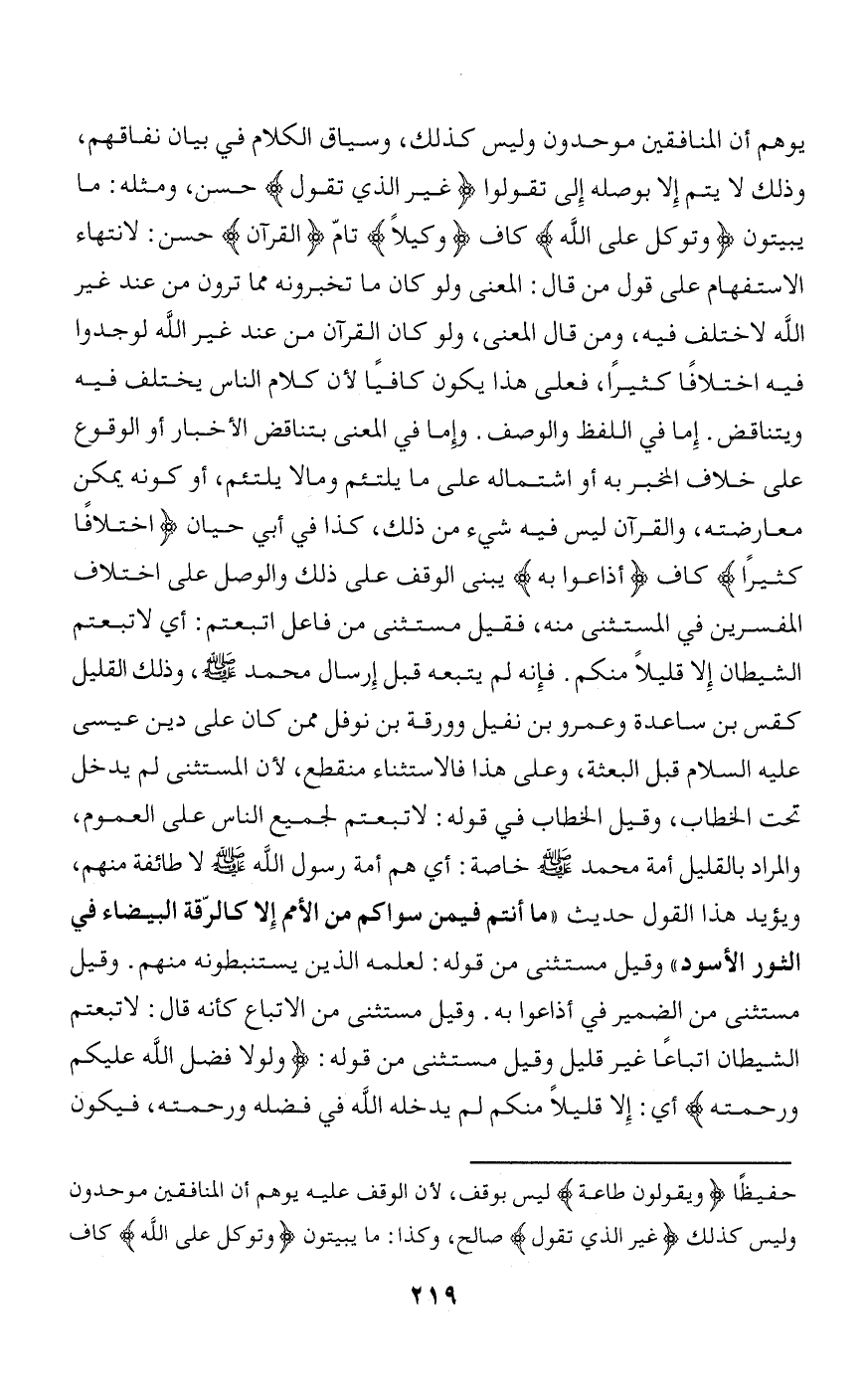 يوهم أن المنافقين موحدون وليس كذلك، وسياق الكلام في بيان نفاقهم، وذلك لا يتم إلا بوصله إلى تقولوا غَيْرَ الَّذِي تَقُولُ حسن، ومثله: ما يبيتون وَتَوَكَّلْ عَلَى اللَّهِ كاف وَكِيلًا تامّ الْقُرْآنَ حسن: لانتهاء الاستفهام على قول من قال: المعنى ولو كان ما تخبرونه مما ترون من عند غير الله لاختلف فيه، ومن قال المعنى، ولو كان القرآن من عند غير الله لوجدوا فيه اختلافا كثيرا، فعلى هذا يكون كافيا لأن كلام الناس يختلف فيه ويتناقض. إما في اللفظ والوصف. وإما في المعنى بتناقض الأخبار أو الوقوع على خلاف المخبر به أو اشتماله على ما يلتئم وما لا يلتئم، أو كونه يمكن معارضته، والقرآن ليس فيه شيء من ذلك، كذا في أبي حيان اخْتِلافاً كَثِيراً كاف أَذاعُوا بِهِ يبنى الوقف على ذلك والوصل على اختلاف المفسرين في المستثنى منه، فقيل مستثنى من فاعل اتبعتم: أي لاتبعتم الشيطان إلا قليلا منكم. فإنه لم يتبعه قبل إرسال محمد صلّى الله عليه وسلّم، وذلك القليل كقس بن ساعدة وعمرو بن نفيل وورقة بن نوفل ممن كان على دين عيسى عليه السلام قبل البعثة، وعلى هذا فالاستثناء منقطع، لأن المستثنى لم يدخل تحت الخطاب، وقيل الخطاب في قوله: لاتبعتم لجميع الناس على العموم، والمراد بالقليل أمة محمد صلّى الله عليه وسلّم خاصة: أي هم أمة رسول الله صلّى الله عليه وسلّم لا طائفة منهم، ويؤيد هذا القول حديث «ما أنتم فيمن سواكم من الأمم إلا كالرّقة البيضاء في الثور الأسود» وقيل مستثنى من قوله: لعلمه الذين يستنبطونه منهم. وقيل مستثنى من الضمير في أذاعوا به. وقيل مستثنى من الاتباع كأنه قال: لاتبعتم الشيطان اتباعا غير قليل وقيل مستثنى من قوله: وَلَوْلا فَضْلُ اللَّهِ عَلَيْكُمْ وَرَحْمَتُهُ أي: إلا قليلا منكم لم يدخله الله في فضله ورحمته، فيكون