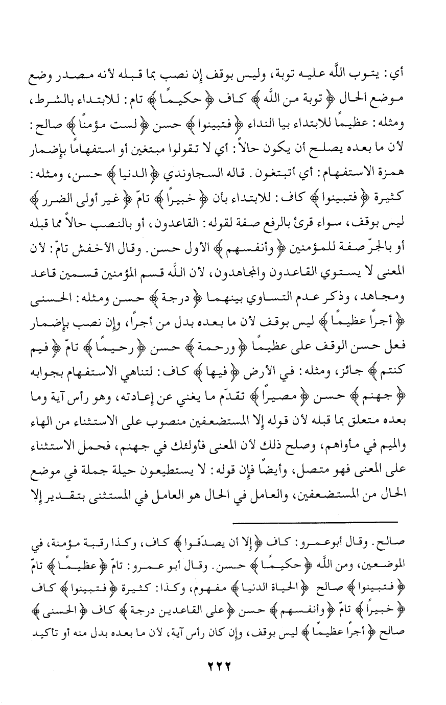كثيرة فَتَبَيَّنُوا كاف: للابتداء بأن خَبِيراً تامّ غَيْرُ أُولِي الضَّرَرِ ليس بوقف، سواء قرئ بالرفع صفة لقوله: القاعدون، أو بالنصب حالا مما قبله أو بالجرّ صفة للمؤمنين وَأَنْفُسِهِمْ الأول حسن. وقال الأخفش تامّ: لأن المعنى لا يستوي القاعدون والمجاهدون، لأن الله قسم المؤمنين قسمين قاعد ومجاهد، وذكر عدم التساوي بينهما دَرَجَةً حسن ومثله: الحسنى أَجْراً عَظِيماً ليس بوقف لأن ما بعده بدل من أجرا، وإن نصب بإضمار فعل حسن الوقف على عظيما وَرَحْمَةً حسن رَحِيماً تامّ فِيمَ كُنْتُمْ جائز، ومثله: في الأرض فِيها كاف: لتناهي الاستفهام بجوابه جَهَنَّمُ حسن مَصِيراً تقدّم ما يغني عن إعادته، وهو رأس آية وما بعده متعلق بما قبله لأن قوله إلا المستضعفين منصوب على الاستثناء من الهاء والميم في مأواهم، وصلح ذلك لأن المعنى فأولئك في جهنم، فحمل الاستثناء على المعنى فهو متصل، وأيضا فإن قوله: لا يستطيعون حيلة جملة في موضع الحال من المستضعفين، والعامل في الحال هو العامل في المستثنى بتقدير إلا