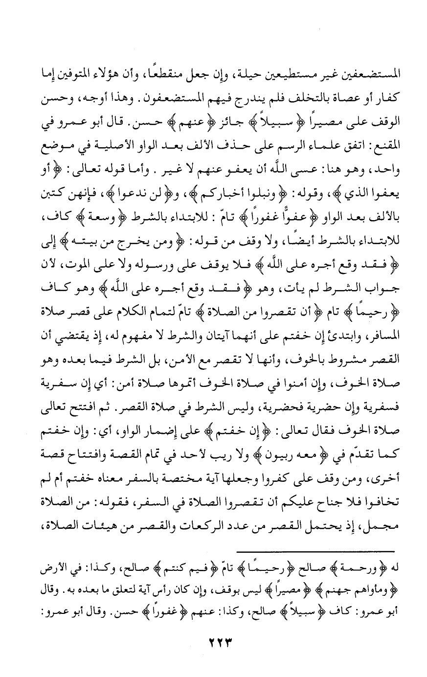 المستضعفين غير مستطيعين حيلة، وإن جعل منقطعا، وأن هؤلاء المتوفين إما كفار أو عصاة بالتخلف فلم يندرج فيهم المستضعفون. وهذا أوجه، وحسن الوقف على مصيرا سَبِيلًا جائز عَنْهُمْ حسن. قال أبو عمرو في المقنع: اتفق علماء الرسم على حذف الألف بعد الواو الأصلية في موضع واحد، وهو هنا: عسى الله أن يعفو عنهم لا غير. وأما قوله تعالى: أَوْ يَعْفُوَا الَّذِي، وقوله: وَنَبْلُوَا أَخْبارَكُمْ، ولَنْ نَدْعُوَا، فإنهن كتبن بالألف بعد الواو عَفُوًّا غَفُوراً تامّ: للابتداء بالشرط وَسَعَةً كاف، للابتداء بالشرط أيضا، ولا وقف من قوله: وَمَنْ يَخْرُجْ مِنْ بَيْتِهِ إلى فَقَدْ وَقَعَ أَجْرُهُ عَلَى اللَّهِ فلا يوقف على ورسوله ولا على الموت، لأن جواب الشرط لم يأت، وهو فَقَدْ وَقَعَ أَجْرُهُ عَلَى اللَّهِ وهو كاف رَحِيماً تام أَنْ تَقْصُرُوا مِنَ الصَّلاةِ تامّ لتمام الكلام على قصر صلاة المسافر، وابتدئ إن خفتم على أنهما آيتان والشرط لا مفهوم له، إذ يقتضي أن القصر مشروط بالخوف، وأنها لا تقصر مع الأمن، بل الشرط فيما بعده وهو صلاة الخوف، وإن أمنوا في صلاة الخوف أتموها صلاة أمن: أي إن سفرية فسفرية وإن حضرية فحضرية، وليس الشرط في صلاة القصر. ثم افتتح تعالى صلاة الخوف فقال تعالى: إِنْ خِفْتُمْ على إضمار الواو، أي: وإن خفتم كما تقدّم في مَعَهُ رِبِّيُّونَ ولا ريب لأحد في تمام القصة وافتتاح قصة أخرى، ومن وقف على كفروا وجعلها آية مختصة بالسفر معناه خفتم أم لم تخافوا فلا جناح عليكم أن تقصروا الصلاة في السفر، فقوله: من الصلاة مجمل، إذ يحتمل القصر من عدد الركعات والقصر من هيئات الصلاة،