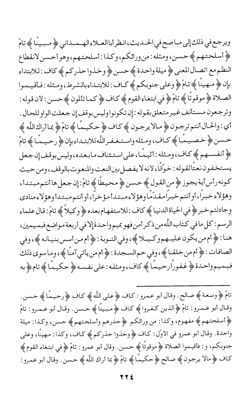 ويرجع في ذلك إلى ما صح في الحديث، انظر أبا العلاء الهمداني مُبِيناً تامّ أَسْلِحَتَهُمْ حسن، ومثله: من ورائكم، وكذا: أسلحتهم، وهو أحسن لانقطاع النظم مع اتصال المعنى مَيْلَةً واحِدَةً حسن وَخُذُوا حِذْرَكُمْ كاف: للابتداء بإن مُهِيناً تامّ وَعَلى جُنُوبِكُمْ كاف: للابتداء بالشرط، ومثله: فأقيموا الصلاة مَوْقُوتاً تامّ فِي ابْتِغاءِ الْقَوْمِ كاف كَما تَأْلَمُونَ حسن: لأن قوله: