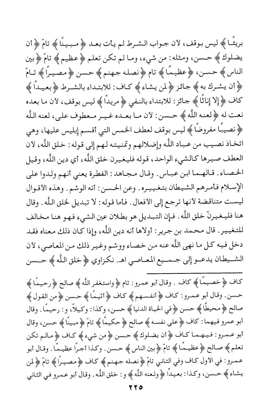 بَرِيئاً ليس بوقف، لأن جواب الشرط لم يأت بعد مُبِيناً تامّ أَنْ يُضِلُّوكَ حسن، ومثله: من شيء، وما لم تكن تعلم عَظِيماً تامّ بَيْنَ النَّاسِ حسن، عَظِيماً تام نُصْلِهِ جَهَنَّمَ حسن مَصِيراً تامّ أَنْ يُشْرَكَ بِهِ جائز لِمَنْ يَشاءُ كاف: للابتداء بالشرط بَعِيداً كاف إِلَّا إِناثاً جائز: للابتداء بالنفي مَرِيداً ليس بوقف، لأن ما بعده نعت له لَعَنَهُ اللَّهُ حسن: لأن ما بعده غير معطوف على، لعنه الله نَصِيباً مَفْرُوضاً ليس بوقف لعطف الخمس التي أقسم إبليس عليها، وهي اتخاذ نصيب من عباد الله وإضلالهم وتمنيته لهم إلى قوله: خلق الله، لأن العطف صيرها كالشيء الواحد، قوله فليغيرن خلق الله، أي دين الله، وقيل الخصاء. قالهما ابن عباس. وقال مجاهد: الفطرة يعني أنهم ولدوا على الإسلام فأمرهم الشيطان بتغييره. وعن الحسن: أنه الوشم. وهذه الأقوال ليست متناقضة لأنها ترجع إلى الأفعال. فأما قوله: لا تبديل لخلق الله. وقال هنا فليغيرنّ خلق الله. فإن التبديل هو بطلان عين الشيء فهو هنا مخالف للتغيير. قال محمد بن جرير: أولاها أنه دين الله، وإذا كان ذلك معناه فقد دخل فيه كل ما نهى الله عنه من خصاء ووشم وغير ذلك من المعاصي، لأن الشيطان يدعو إلى جميع المعاصي اه. نكزاوي خَلْقَ اللَّهِ حسن