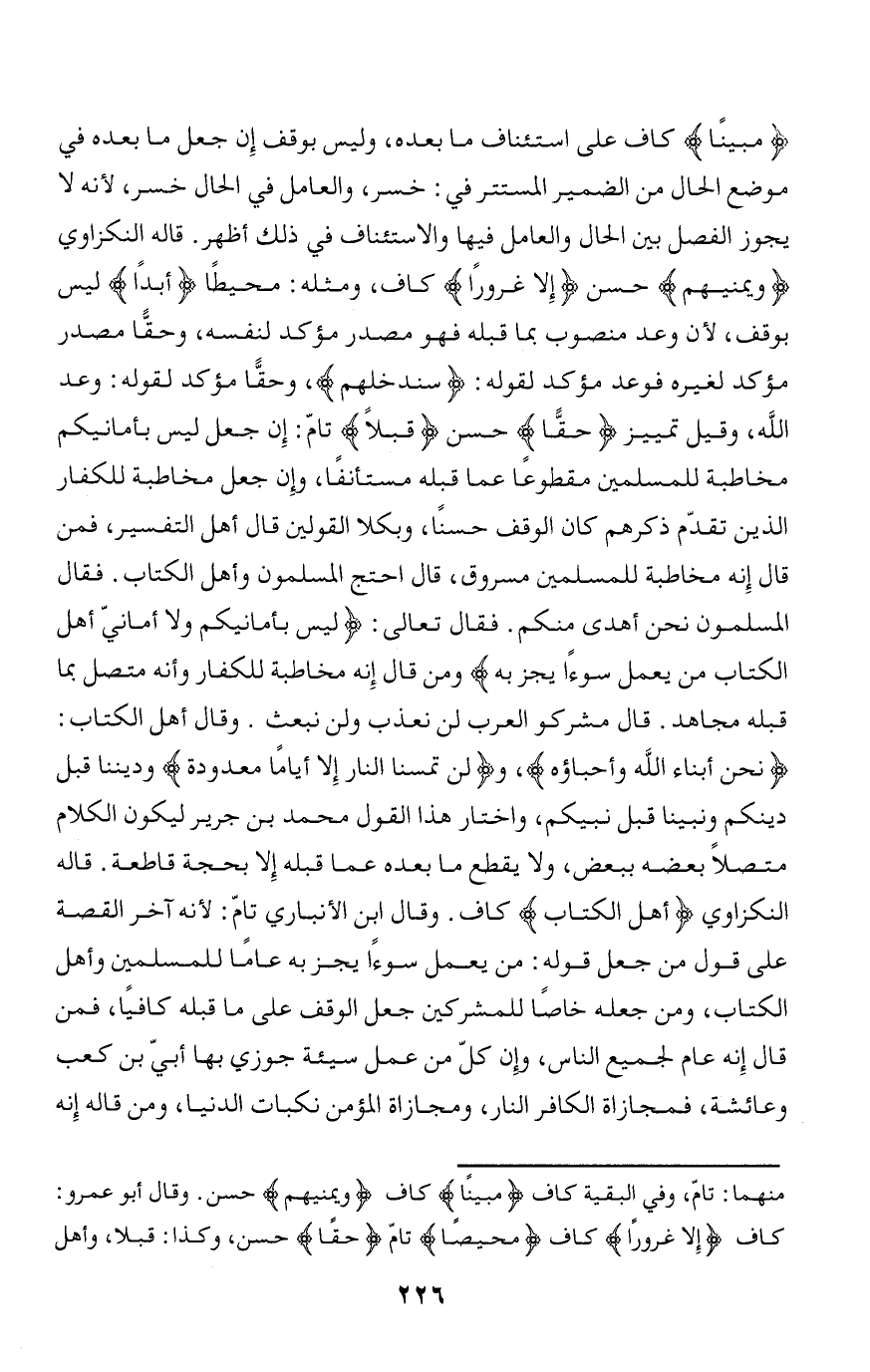 نَحْنُ أَبْناءُ اللَّهِ وَأَحِبَّاؤُهُ، ولَنْ تَمَسَّنَا النَّارُ إِلَّا أَيَّاماً مَعْدُودَةً وديننا قبل دينكم ونبينا قبل نبيكم، واختار هذا القول محمد بن جرير ليكون الكلام متصلا بعضه ببعض، ولا يقطع ما بعده عما قبله إلا بحجة قاطعة. قاله النكزاوي أَهْلِ الْكِتابِ كاف. وقال ابن الأنباري تامّ: لأنه آخر القصة على قول من جعل قوله: من يعمل سوءا يجز به عاما للمسلمين وأهل الكتاب، ومن جعله خاصا للمشركين جعل الوقف على ما قبله كافيا، فمن قال إنه عام لجميع الناس، وإن كلّ من عمل سيئة جوزي بها أبيّ بن كعب وعائشة، فمجازاة الكافر النار، ومجازاة المؤمن نكبات الدنيا، ومن قاله إنه