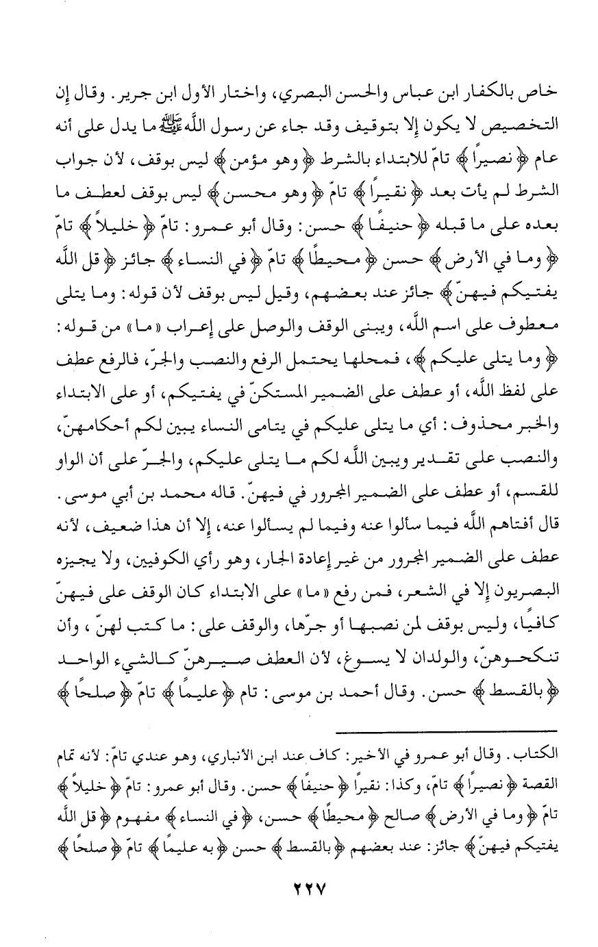 أنه عام نَصِيراً تامّ للابتداء بالشرط وَهُوَ مُؤْمِنٌ ليس بوقف، لأن جواب الشرط لم يأت بعد نَقِيراً تامّ وَهُوَ مُحْسِنٌ ليس بوقف لعطف ما بعده على ما قبله حَنِيفاً حسن: وقال أبو عمرو: تامّ خَلِيلًا تامّ وَما فِي الْأَرْضِ حسن مُحِيطاً تامّ فِي النِّساءِ جائز قُلِ اللَّهُ يُفْتِيكُمْ فِيهِنَّ جائز عند بعضهم، وقيل ليس بوقف لأن قوله: وما يتلى معطوف على اسم الله، ويبنى الوقف والوصل على إعراب «ما» من قوله: