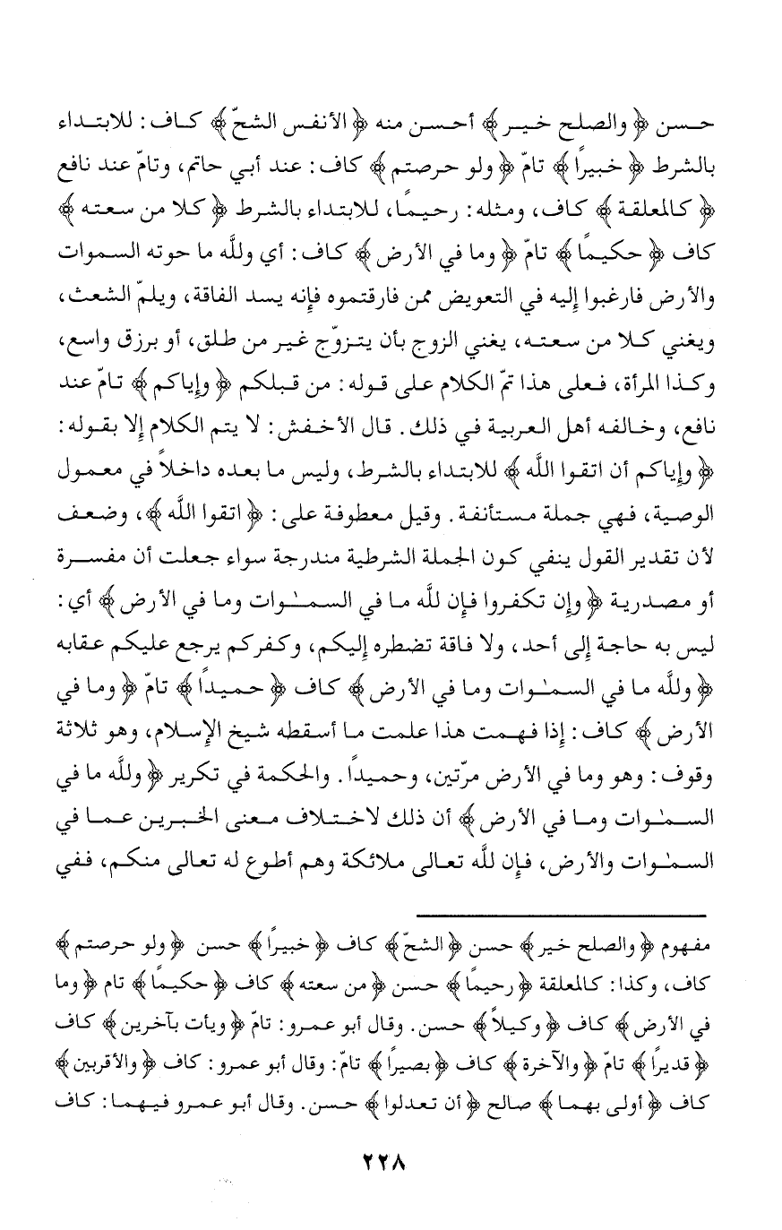 حسن وَالصُّلْحُ خَيْرٌ أحسن منه الْأَنْفُسُ الشُّحَّ كاف: للابتداء بالشرط خَبِيراً تامّ وَلَوْ حَرَصْتُمْ كاف: عند أبي حاتم، وتامّ عند نافع كَالْمُعَلَّقَةِ كاف، ومثله: رحيما، للابتداء بالشرط كُلًّا مِنْ سَعَتِهِ كاف حَكِيماً تامّ وَما فِي الْأَرْضِ كاف: أي ولله ما حوته السموات والأرض فارغبوا إليه في التعويض ممن فارقتموه فإنه يسد الفاقة، ويلمّ الشعث، ويغني كلا من سعته، يغني الزوج بأن يتزوّج غير من طلق، أو برزق واسع، وكذا المرأة، فعلى هذا تمّ الكلام على قوله: من قبلكم وَإِيَّاكُمْ تامّ عند نافع، وخالفه أهل العربية في ذلك. قال الأخفش: لا يتم الكلام إلا بقوله: