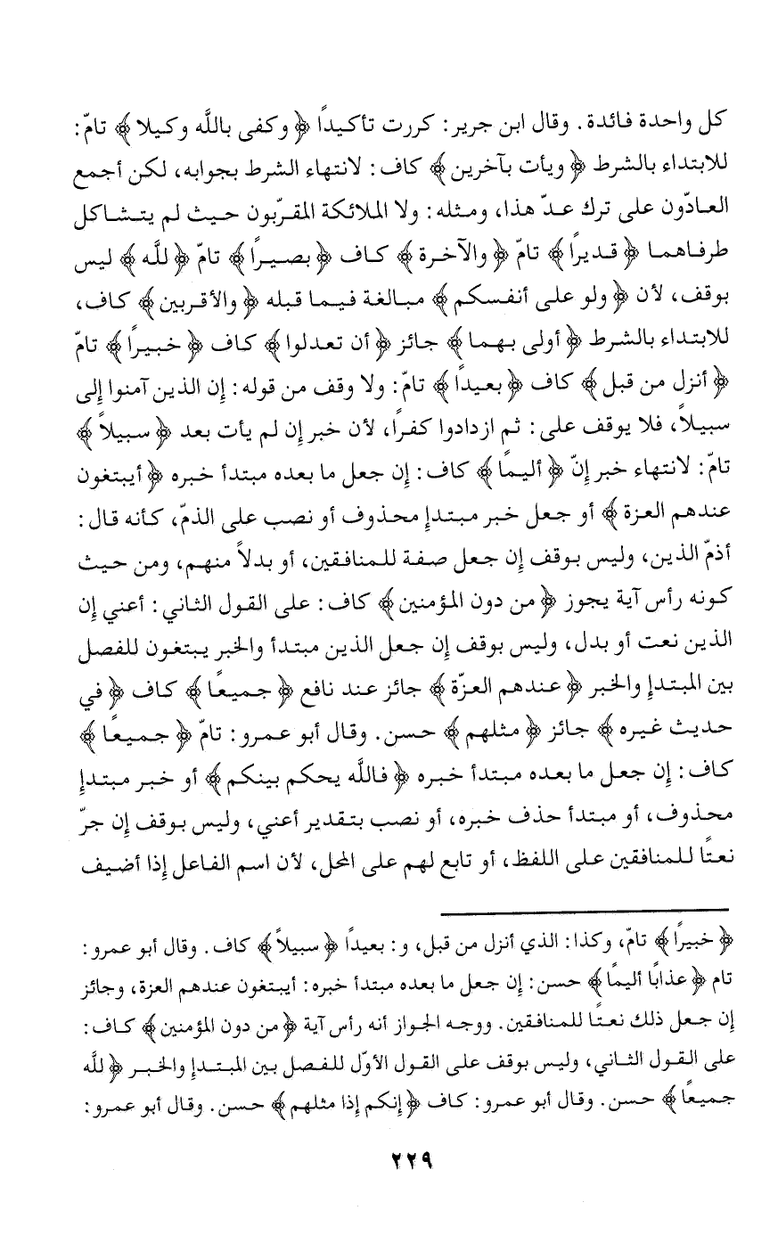 للابتداء بالشرط وَيَأْتِ بِآخَرِينَ كاف: لانتهاء الشرط بجوابه، لكن أجمع العادّون على ترك عدّ هذا، ومثله: ولا الملائكة المقرّبون حيث لم يتشاكل طرفاهما قَدِيراً تامّ وَالْآخِرَةِ كاف بَصِيراً تامّ لِلَّهِ ليس بوقف، لأن وَلَوْ عَلى أَنْفُسِكُمْ مبالغة فيما قبله وَالْأَقْرَبِينَ كاف، للابتداء بالشرط أَوْلى بِهِما جائز أَنْ تَعْدِلُوا كاف خَبِيراً تامّ أَنْزَلَ مِنْ قَبْلُ كاف بَعِيداً تامّ: ولا وقف من قوله: إن الذين آمنوا إلى سبيلا، فلا يوقف على: ثم ازدادوا كفرا، لأن خبر إن لم يأت بعد سَبِيلًا تامّ: لانتهاء خبر إنّ أَلِيماً كاف: إن جعل ما بعده مبتدأ خبره أَيَبْتَغُونَ عِنْدَهُمُ الْعِزَّةَ أو جعل خبر مبتدإ محذوف أو نصب على الذمّ، كأنه قال: