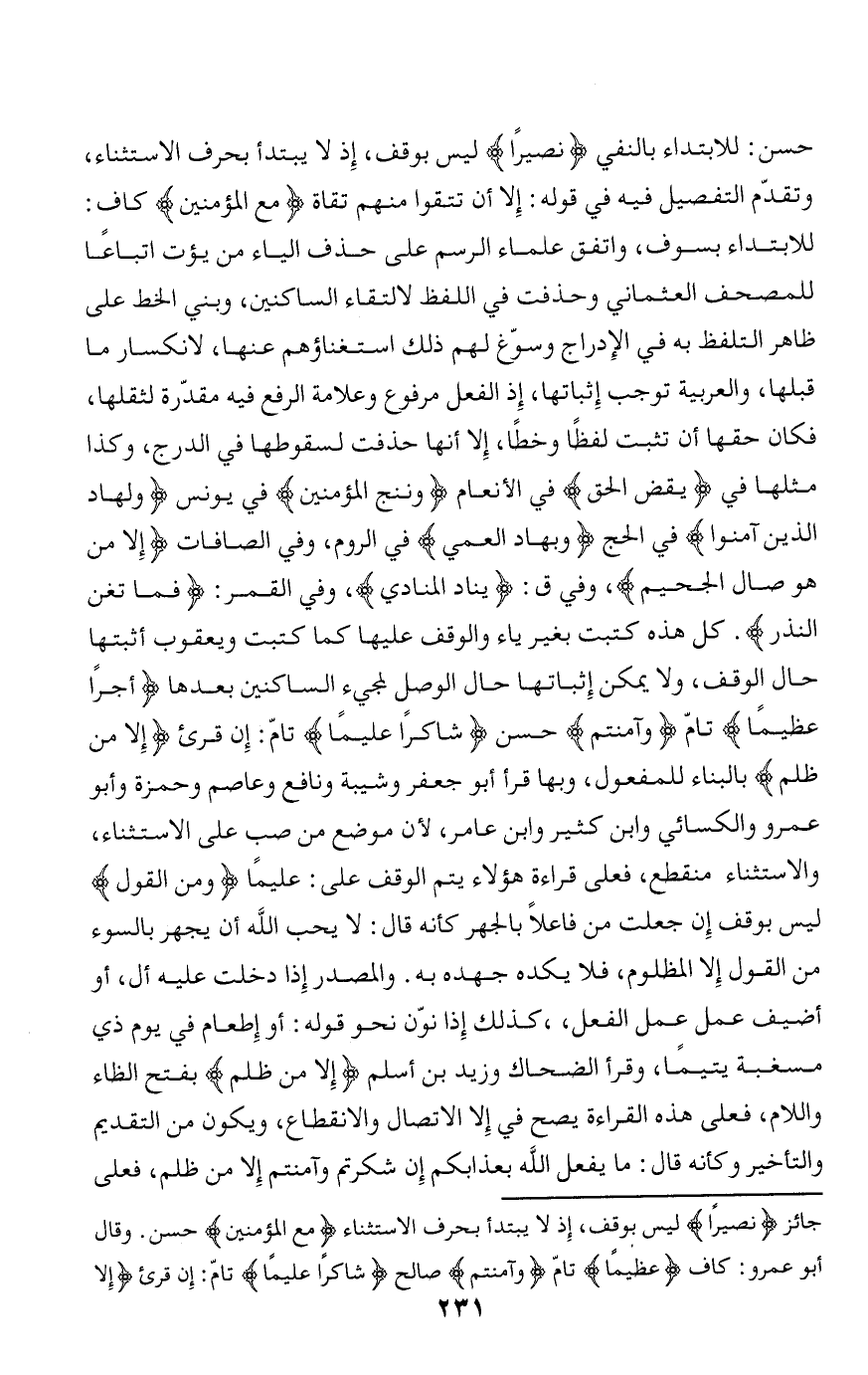 للابتداء بسوف، واتفق علماء الرسم على حذف الياء من يؤت اتباعا للمصحف العثماني وحذفت في اللفظ لالتقاء الساكنين، وبني الخط على ظاهر التلفظ به في الإدراج وسوّغ لهم ذلك استغناؤهم عنها، لانكسار ما قبلها، والعربية توجب إثباتها، إذ الفعل مرفوع وعلامة الرفع فيه مقدّرة لثقلها، فكان حقها أن تثبت لفظا وخطا، إلا أنها حذفت لسقوطها في الدرج، وكذا مثلها في يقض الحق في الأنعام ونُنْجِ الْمُؤْمِنِينَ في يونس ولَهادِ الَّذِينَ آمَنُوا في الحج وبِهادِ الْعُمْيِ في الروم، وفي الصافات إِلَّا مَنْ هُوَ صالِ الْجَحِيمِ، وفي ق: يُنادِ الْمُنادِ، وفي القمر: فَما تُغْنِ النُّذُرُ. كل هذه كتبت بغير ياء والوقف عليها كما كتبت ويعقوب أثبتها حال الوقف، ولا يمكن إثباتها حال الوصل لمجيء الساكنين بعدها أَجْراً عَظِيماً تامّ وَآمَنْتُمْ حسن شاكِراً عَلِيماً تامّ: إن قرئ إِلَّا مَنْ ظُلِمَ بالبناء للمفعول، وبها قرأ أبو جعفر وشيبة ونافع وعاصم وحمزة وأبو عمرو والكسائي وابن كثير وابن عامر، لأن موضع من صب على الاستثناء، والاستثناء منقطع، فعلى قراءة هؤلاء يتم الوقف على: عليما ومِنَ الْقَوْلِ ليس بوقف إن جعلت من فاعلا بالجهر كأنه قال: لا يحب الله أن يجهر بالسوء من القول إلا المظلوم، فلا يكده جهده به. والمصدر إذا دخلت عليه أل، أو أضيف عمل عمل الفعل،، كذلك إذا نوّن نحو قوله: أو إطعام في يوم ذي مسغبة يتيما، وقرأ الضحاك وزيد بن أسلم إِلَّا مَنْ ظُلِمَ بفتح الظاء واللام، فعلى هذه القراءة يصح في إلا الاتصال والانقطاع، ويكون من التقديم والتأخير وكأنه قال: ما يفعل الله بعذابكم إن شكرتم وآمنتم إلا من ظلم، فعلى
