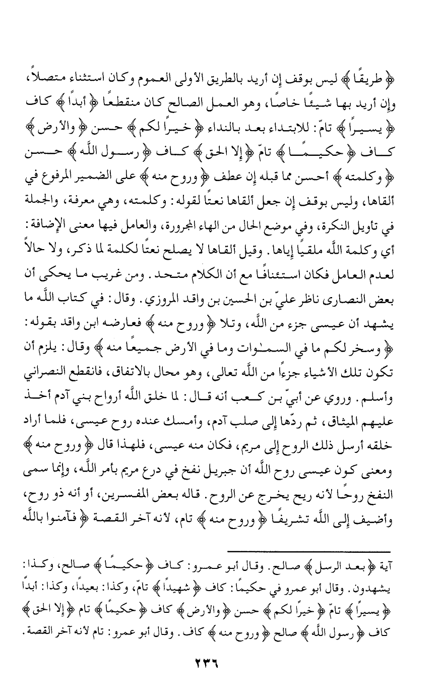 طَرِيقاً ليس بوقف إن أريد بالطريق الأولى العموم وكان استثناء متصلا، وإن أريد بها شيئا خاصا، وهو العمل الصالح كان منقطعا أَبَداً كاف يَسِيراً تامّ: للابتداء بعد بالنداء خَيْراً لَكُمْ حسن وَالْأَرْضِ كاف حَكِيماً تامّ إِلَّا الْحَقَّ كاف رَسُولُ اللَّهِ حسن وَكَلِمَتُهُ أحسن مما قبله إن عطف وَرُوحٌ مِنْهُ على الضمير المرفوع في ألقاها، وليس بوقف إن جعل ألقاها نعتا لقوله: وكلمته، وهي معرفة، والجملة في تأويل النكرة، وفي موضع الحال من الهاء المجرورة، والعامل فيها معنى الإضافة: