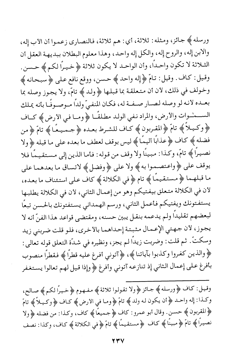 وقيل: كاف وَرُسُلِهِ جائز وَلا تَقُولُوا ثَلاثَةٌ مفهوم خَيْراً لَكُمْ صالح، وكذا: إله واحد أَنْ يَكُونَ لَهُ وَلَدٌ تامّ وَما فِي الْأَرْضِ كاف وَكِيلًا تامّ الْمُقَرَّبُونَ حسن. وقال أبو عمرو: كاف جَمِيعاً كاف، وكذا: من فضله وَلا نَصِيراً تامّ مُبِيناً كاف مُسْتَقِيماً تامّ فِي الْكَلالَةِ كاف، وكذا: نصف