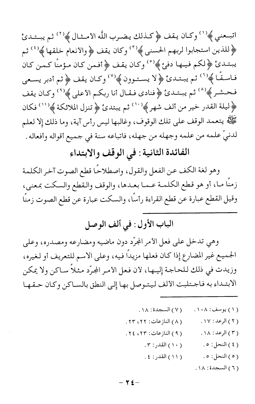 اتَّبَعَنِي (¬1) وكان يقف كَذلِكَ يَضْرِبُ اللَّهُ الْأَمْثالَ (¬2) ثم يبتدئ لِلَّذِينَ اسْتَجابُوا لِرَبِّهِمُ الْحُسْنى (¬3) وكان يقف وَالْأَنْعامَ خَلَقَها (¬4) ثم يبتدئ لَكُمْ فِيها دِفْءٌ (¬5) وكان يقف أَفَمَنْ كانَ مُؤْمِناً كَمَنْ كانَ فاسِقاً (¬6) ثم يبتدئ لا يَسْتَوُونَ (¬7) وكان يقف ثُمَّ أَدْبَرَ يَسْعى فَحَشَرَ (¬8) ثم يبتدئ فَنادى فَقالَ أَنَا رَبُّكُمُ الْأَعْلى (¬9) وكان يقف لَيْلَةُ الْقَدْرِ خَيْرٌ مِنْ أَلْفِ شَهْرٍ (¬10) ثم يبتدئ تَنَزَّلُ الْمَلائِكَةُ (¬11) فكان صلّى الله عليه وسلّم يتعمد الوقف على تلك الوقوف، وغالبها ليس رأس آية، وما ذلك إلا لعلم لدنيّ علمه من علمه وجهله من جهله، فاتباعه سنة في جميع أقواله وأفعاله.
