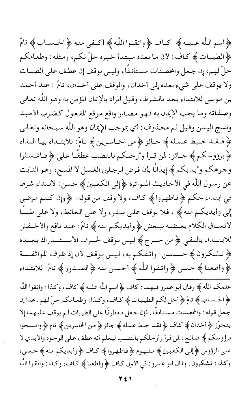 عَلَّمَكُمُ اللَّهُ وقال أبو عمرو فيهما: كاف اسْمَ اللَّهِ عَلَيْهِ كاف، وكذا: واتقوا الله الْحِسابِ تامّ أُحِلَّ لَكُمُ الطَّيِّباتُ كاف، وكذا: وطعامكم حلّ لهم. هذا إن جعل قوله: والمحصنات مستأنفا. فإن جعل معطوفا على الطيبات لم يوقف عليهما إلا بتجوّز أَخْدانٍ كاف فَقَدْ حَبِطَ عَمَلُهُ جائز مِنَ الْخاسِرِينَ تام وَامْسَحُوا بِرُؤُسِكُمْ صالح: لمن قرأ وأرجلكم بالنصب ليعلم أنه عطف على الوجوه والأيدي لا على الرءوس إِلَى الْكَعْبَيْنِ مفهوم فَاطَّهَّرُوا كاف وَأَيْدِيكُمْ مِنْهُ حسن، وكذا: تشكرون. وقال أبو عمرو: في الأول كاف وَأَطَعْنا كاف، وكذا: واتقوا الله