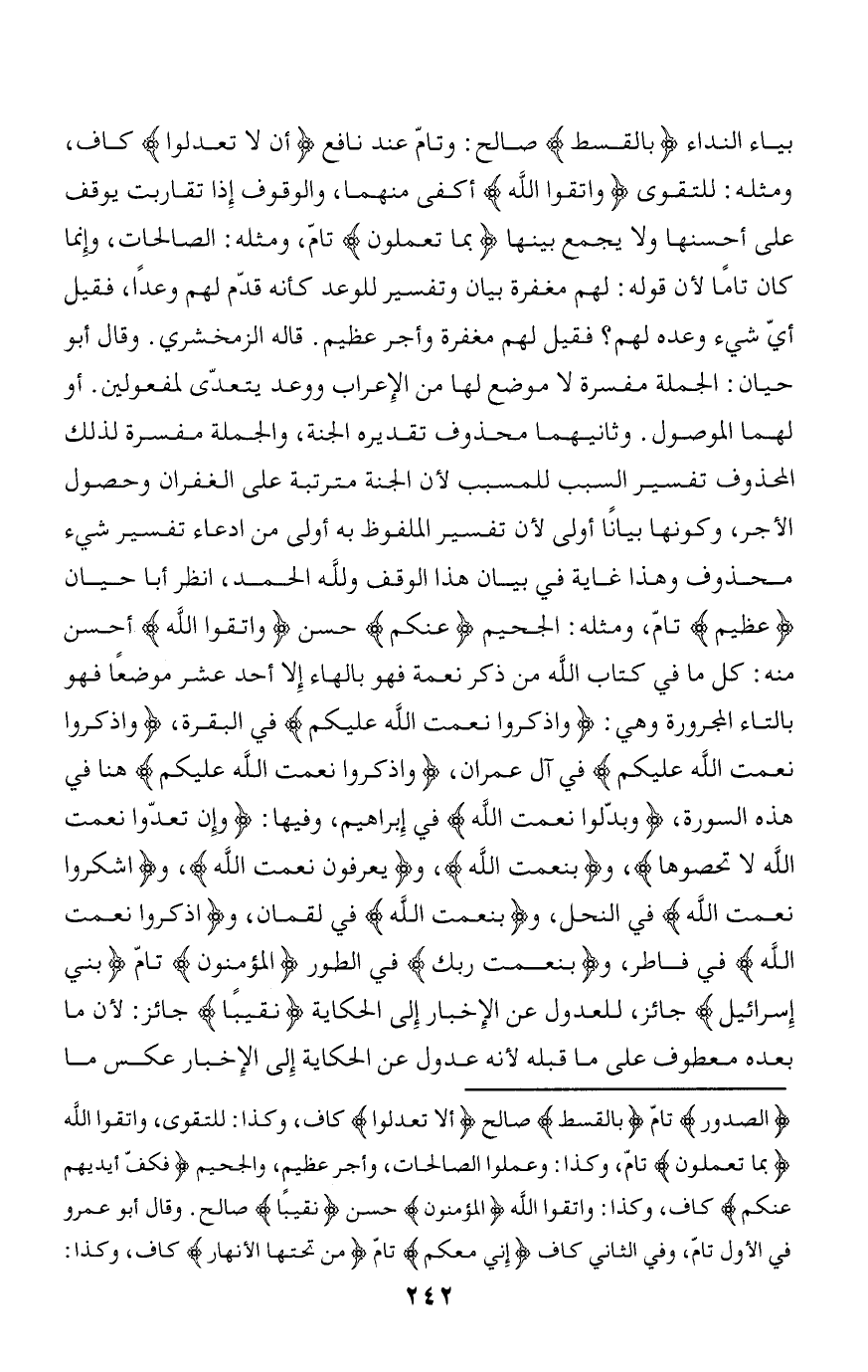 بياء النداء بِالْقِسْطِ صالح: وتامّ عند نافع أَلَّا تَعْدِلُوا كاف، ومثله: للتقوى وَاتَّقُوا اللَّهَ أكفى منهما، والوقوف إذا تقاربت يوقف على أحسنها ولا يجمع بينها بِما تَعْمَلُونَ تامّ، ومثله: الصالحات، وإنما كان تامّا لأن قوله: لهم مغفرة بيان وتفسير للوعد كأنه قدّم لهم وعدا، فقيل أيّ شيء وعده لهم؟ فقيل لهم مغفرة وأجر عظيم. قاله الزمخشري. وقال أبو حيان: الجملة مفسرة لا موضع لها من الإعراب ووعد يتعدّى لمفعولين. أو لهما الموصول. وثانيهما محذوف تقديره الجنة، والجملة مفسرة لذلك المحذوف تفسير السبب للمسبب لأن الجنة مترتبة على الغفران وحصول الأجر، وكونها بيانا أولى لأن تفسير الملفوظ به أولى من ادعاء تفسير شيء محذوف وهذا غاية في بيان هذا الوقف ولله الحمد، انظر أبا حيان عَظِيمٌ تامّ، ومثله: الجحيم عَنْكُمْ حسن وَاتَّقُوا اللَّهَ أحسن منه: كل ما في كتاب الله من ذكر نعمة فهو بالهاء إلا أحد عشر موضعا فهو بالتاء المجرورة وهي: وَاذْكُرُوا نِعْمَتَ اللَّهِ عَلَيْكُمْ في البقرة، وَاذْكُرُوا نِعْمَتَ اللَّهِ عَلَيْكُمْ في آل عمران، واذْكُرُوا نِعْمَتَ اللَّهِ عَلَيْكُمْ هنا في هذه السورة، وبَدَّلُوا نِعْمَتَ اللَّهِ في إبراهيم، وفيها: وَإِنْ تَعُدُّوا نِعْمَتَ اللَّهِ لا تُحْصُوها، وبِنِعْمَتِ اللَّهِ، ويَعْرِفُونَ نِعْمَتَ اللَّهِ، واشْكُرُوا نِعْمَتَ اللَّهِ في النحل، وبِنِعْمَتِ اللَّهِ في لقمان، واذْكُرُوا نِعْمَتَ اللَّهِ في فاطر، وبنعمت ربك في الطور الْمُؤْمِنُونَ تامّ بَنِي إِسْرائِيلَ جائز، للعدول عن الإخبار إلى الحكاية نَقِيباً جائز: لأن ما بعده معطوف على ما قبله لأنه عدول عن الحكاية إلى الإخبار عكس ما