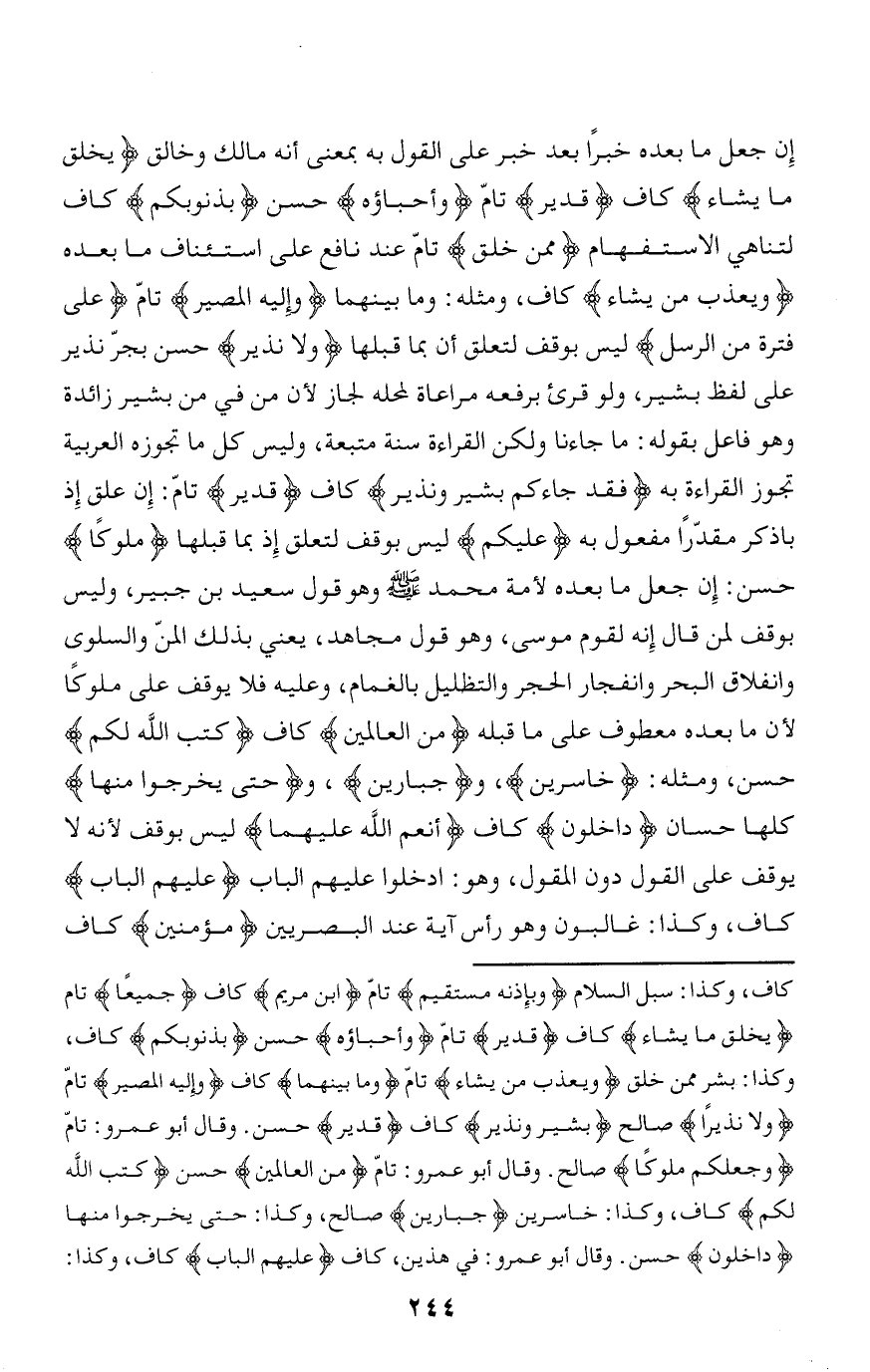 كاف، وكذا: سبل السلام وبِإِذْنِهِ مُسْتَقِيمٍ تامّ ابْنُ مَرْيَمَ كاف جَمِيعاً تام يَخْلُقُ ما يَشاءُ كاف قَدِيرٌ تامّ وَأَحِبَّاؤُهُ حسن بِذُنُوبِكُمْ كاف، وكذا: بشر ممن خلق وَيُعَذِّبُ مَنْ يَشاءُ تامّ وَما بَيْنَهُما كاف وَإِلَيْهِ الْمَصِيرُ تامّ وَلا نَذِيرٍ صالح بَشِيرٌ وَنَذِيرٌ كاف قَدِيرٌ حسن. وقال أبو عمرو: تامّ وَجَعَلَكُمْ مُلُوكاً صالح. وقال أبو عمرو: تامّ مِنَ الْعالَمِينَ حسن كَتَبَ اللَّهُ لَكُمْ كاف، وكذا: خاسرين جَبَّارِينَ صالح، وكذا: حتى يخرجوا منها داخِلُونَ حسن. وقال أبو عمرو: في هذين، كاف عَلَيْهِمُ الْبابَ كاف، وكذا: