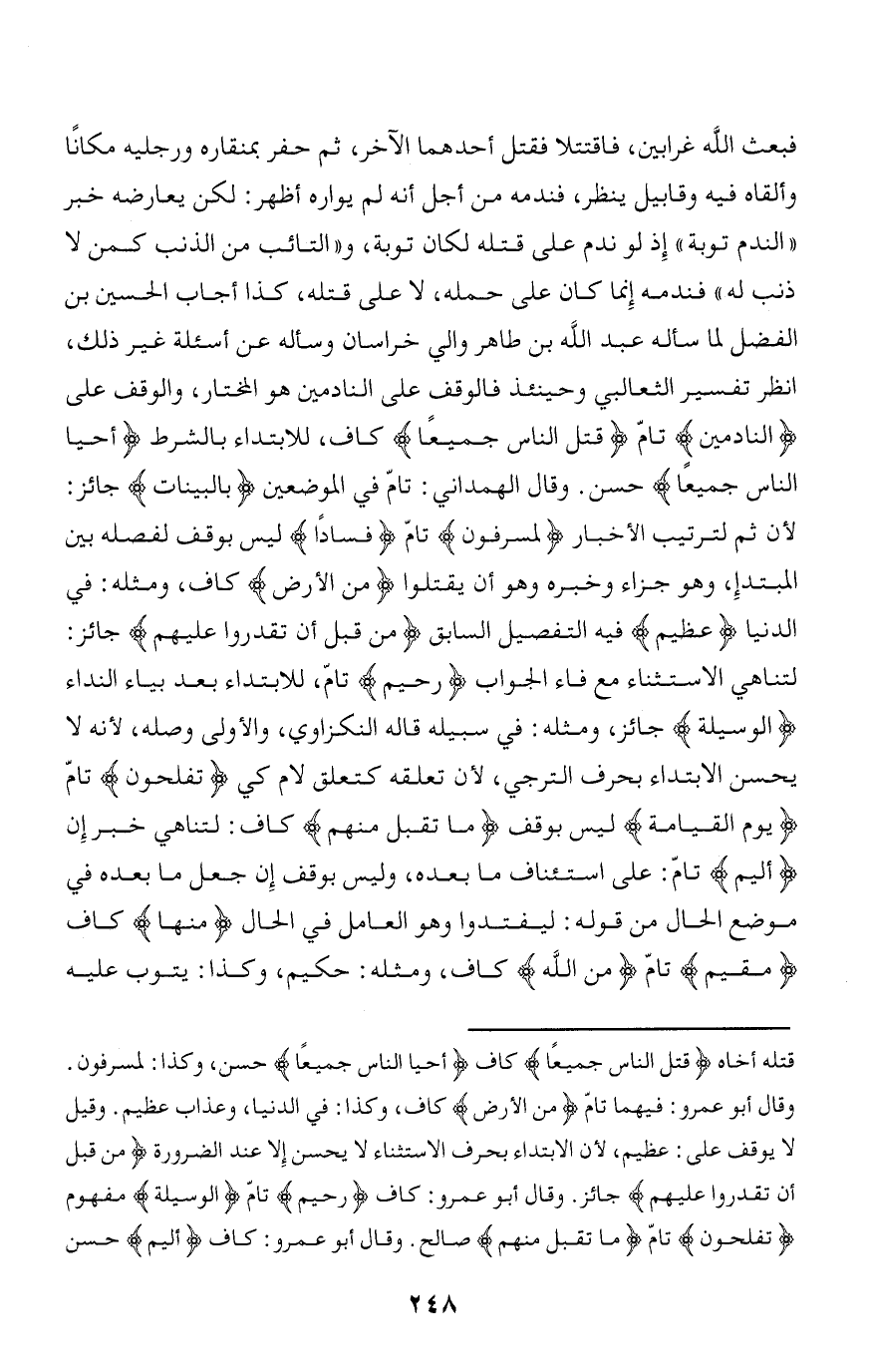 لتناهي الاستثناء مع فاء الجواب رَحِيمٌ تامّ، للابتداء بعد بياء النداء الْوَسِيلَةَ جائز، ومثله: في سبيله قاله النكزاوي، والأولى وصله، لأنه لا يحسن الابتداء بحرف الترجي، لأن تعلقه كتعلق لام كي تُفْلِحُونَ تامّ يَوْمِ الْقِيامَةِ ليس بوقف ما تُقُبِّلَ مِنْهُمْ كاف: لتناهي خبر إن أَلِيمٌ تامّ: على استئناف ما بعده، وليس بوقف إن جعل ما بعده في موضع الحال من قوله: ليفتدوا وهو العامل في الحال مِنْها كاف مُقِيمٌ تامّ مِنَ اللَّهِ كاف، ومثله: حكيم، وكذا: يتوب عليه