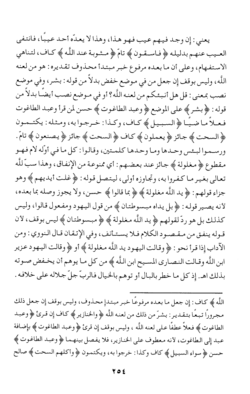 ورسموا لبئس وحدها وما وحدها كلمتين، وقالوا: كل ما في أوّله لام فهو مقطوع مَغْلُولَةٌ جائز عند بعضهم: أي ممنوعة من الإنفاق، وهذا سبّ لله تعالى بغير ما كفروا به، وتجاوزه أولى، ليتصل قوله: غُلَّتْ أَيْدِيهِمْ وهو جزاء قولهم: يَدُ اللَّهِ مَغْلُولَةٌ بِما قالُوا حسن، ولا يجوز وصله بما بعده، لأنه يصير قوله: بَلْ يَداهُ مَبْسُوطَتانِ من قول اليهود ومفعول قالوا، وليس كذلك بل هو ردّ لقولهم يَدُ اللَّهِ مَغْلُولَةٌ مَبْسُوطَتانِ ليس بوقف، لأن قوله ينفق من مقصود الكلام فلا يستأنف، وفي الإتقان قال النووي: ومن الآداب إذا قرأ نحو: وَقالَتِ الْيَهُودُ يَدُ اللَّهِ مَغْلُولَةٌ أو وَقالَتِ الْيَهُودُ عُزَيْرٌ ابْنُ اللَّهِ وَقالَتِ النَّصارى الْمَسِيحُ ابْنُ اللَّهِ من كل ما يوهم أن يخفض صوته بذلك اه. إذ كل ما خطر بالبال أو توهم بالخيال فالربّ جلّ جلاله على خلافه.