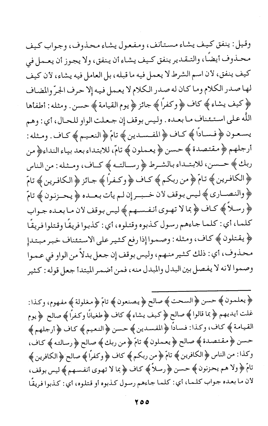 وقيل: ينفق كيف يشاء مستأنف، ومفعول يشاء محذوف، وجواب كيف محذوف أيضا، والتقدير ينفق كيف يشاء أن ينفق، ولا يجوز أن يعمل في كيف ينفق، لأن اسم الشرط لا يعمل فيه ما قبله، بل العامل فيه يشاء، لأن كيف لها صدر الكلام وما كان له صدر الكلام لا يعمل فيه إلا حرف الجرّ والمضاف كَيْفَ يَشاءُ كاف وَكُفْراً جائز يَوْمِ الْقِيامَةِ حسن. ومثله: أطفأها الله على استئناف ما بعده. وليس بوقف إن جعلت الواو للحال، أي: وهم يسعون فَساداً كاف الْمُفْسِدِينَ تامّ النَّعِيمِ كاف. ومثله: