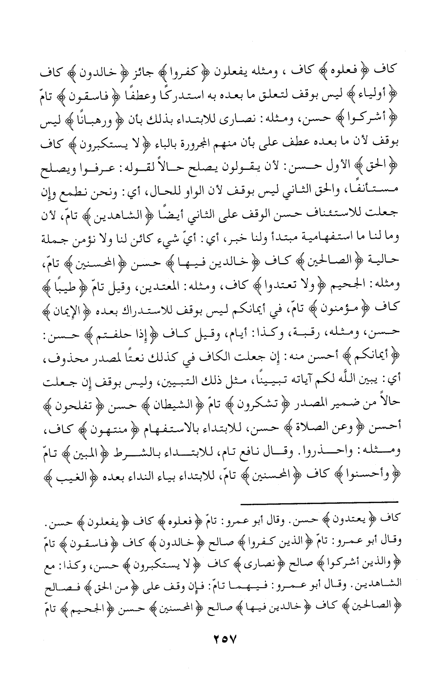 كاف فَعَلُوهُ كاف، ومثله يفعلون كَفَرُوا جائز خالِدُونَ كاف أَوْلِياءَ ليس بوقف لتعلق ما بعده به استدراكا وعطفا فاسِقُونَ تامّ أَشْرَكُوا حسن، ومثله: نصارى للابتداء بذلك بأن وَرُهْباناً ليس بوقف لأن ما بعده عطف على بأن منهم المجرورة بالباء لا يَسْتَكْبِرُونَ كاف الْحَقِّ الأول حسن: لأن يقولون يصلح حالا لقوله: عرفوا ويصلح مستأنفا، والحق الثاني ليس بوقف لأن الواو للحال، أي: ونحن نطمع وإن جعلت للاستئناف حسن الوقف على الثاني أيضا الشَّاهِدِينَ تامّ، لأن وما لنا ما استفهامية مبتدأ ولنا خبر، أي: أيّ شيء كائن لنا ولا نؤمن جملة حالية الصَّالِحِينَ كاف خالِدِينَ فِيها حسن الْمُحْسِنِينَ تامّ، ومثله: الجحيم وَلا تَعْتَدُوا كاف، ومثله: المعتدين، وقيل تامّ طَيِّباً كاف مُؤْمِنُونَ تامّ، في أيمانكم ليس بوقف للاستدراك بعده الْأَيْمانَ حسن، ومثله، رقبة، وكذا: أيام، وقيل كاف إِذا حَلَفْتُمْ حسن: