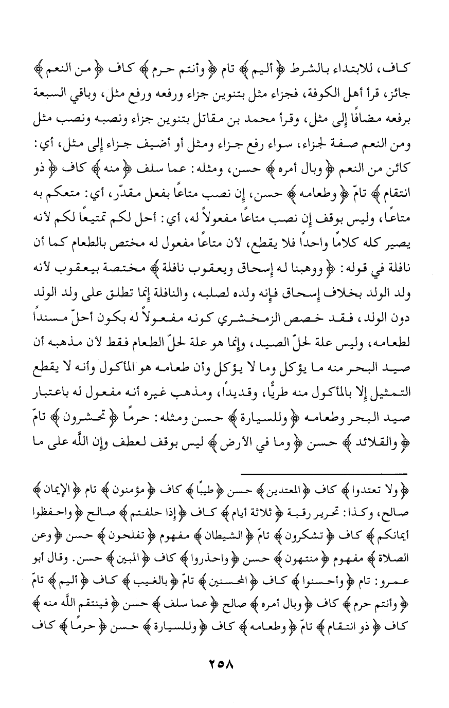 كائن من النعم وَبالَ أَمْرِهِ حسن، ومثله: عما سلف مِنْهُ كاف ذُو انْتِقامٍ تامّ وَطَعامُهُ حسن، إن نصب متاعا بفعل مقدّر، أي: متعكم به متاعا، وليس بوقف إن نصب متاعا مفعولا له، أي: أحل لكم تمتيعا لكم لأنه يصير كله كلاما واحدا فلا يقطع، لأن متاعا مفعول له مختص بالطعام كما أن نافلة في قوله: وَوَهَبْنا لَهُ إِسْحاقَ وَيَعْقُوبَ نافِلَةً مختصة بيعقوب لأنه ولد الولد بخلاف إسحاق فإنه ولده لصلبه، والنافلة إنما تطلق على ولد الولد دون الولد، فقد خصص الزمخشري كونه مفعولا له بكون أحلّ مسندا