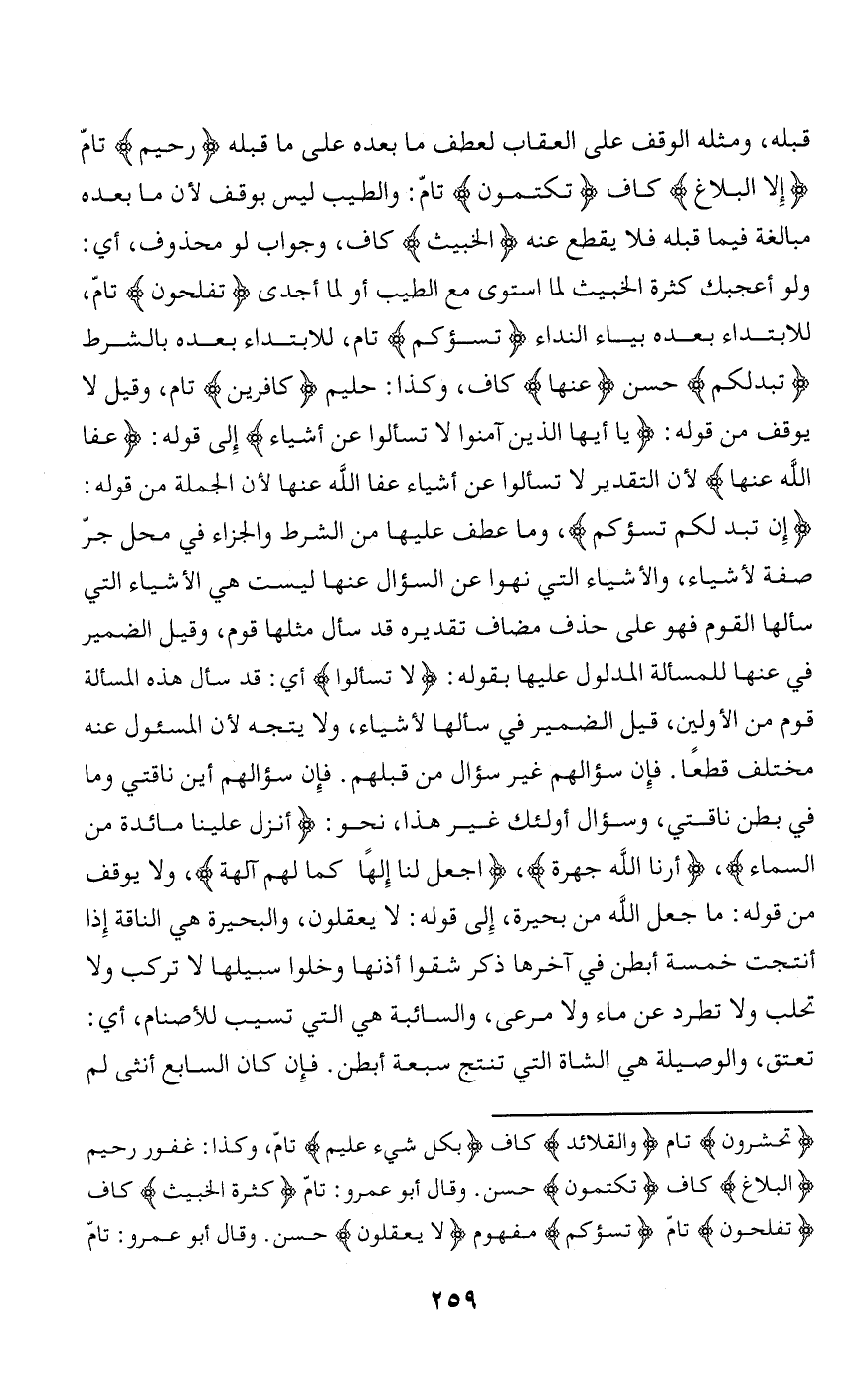 ولو أعجبك كثرة الخبيث لما استوى مع الطيب أو لما أجدى تُفْلِحُونَ تامّ، للابتداء بعده بياء النداء تَسُؤْكُمْ تام، للابتداء بعده بالشرط تُبْدَ لَكُمْ حسن عَنْها كاف، وكذا: حليم كافِرِينَ تام، وقيل لا يوقف من قوله: يا أَيُّهَا الَّذِينَ آمَنُوا لا تَسْئَلُوا عَنْ أَشْياءَ إلى قوله: عَفَا اللَّهُ عَنْها لأن التقدير لا تسألوا عن أشياء عفا الله عنها لأن الجملة من قوله: