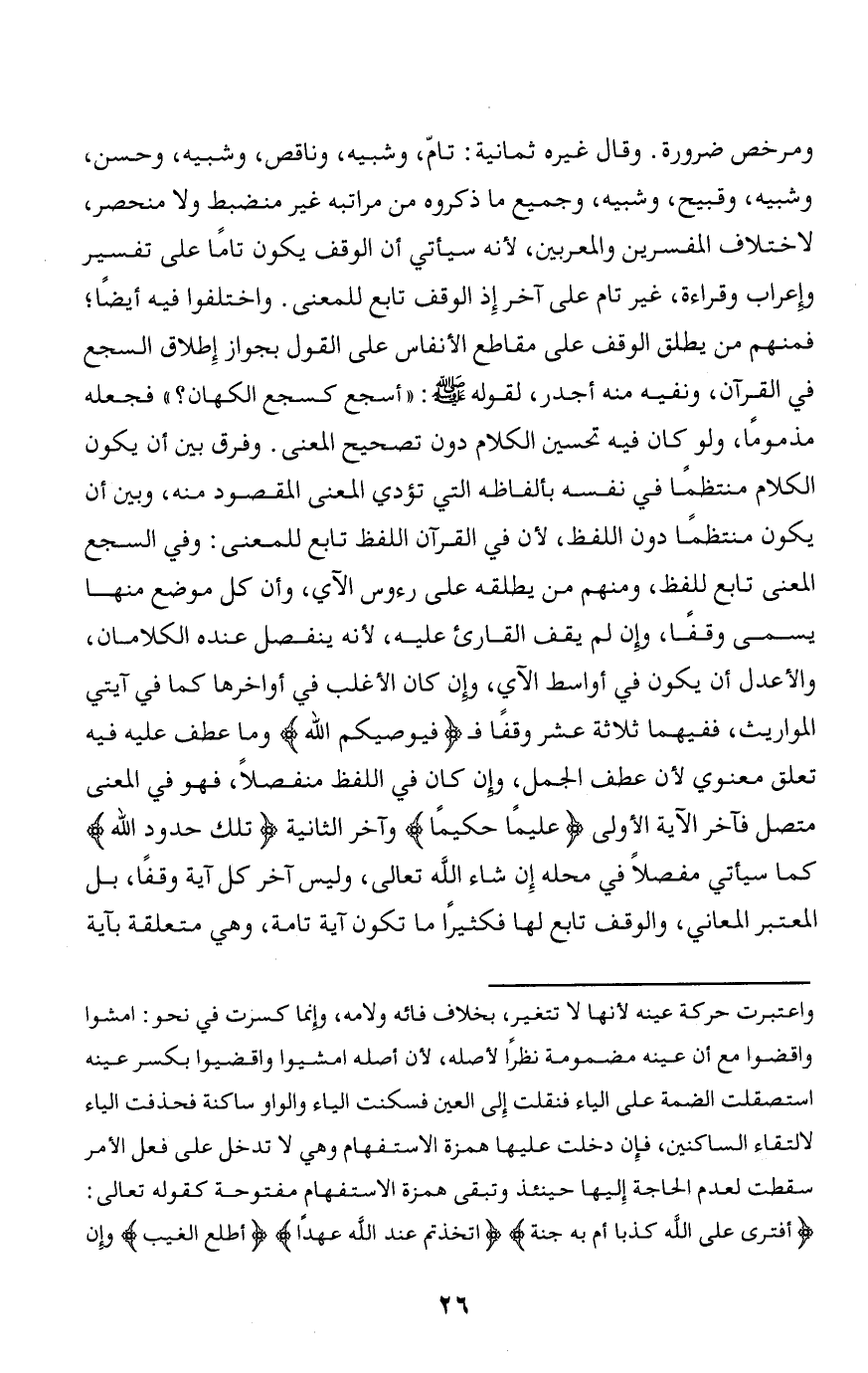 ومرخص ضرورة. وقال غيره ثمانية: تامّ، وشبيه، وناقص، وشبيه، وحسن، وشبيه، وقبيح، وشبيه، وجميع ما ذكروه من مراتبه غير منضبط ولا منحصر، لاختلاف المفسرين والمعربين، لأنه سيأتي أن الوقف يكون تاما على تفسير وإعراب وقراءة، غير تام على آخر إذ الوقف تابع للمعنى. واختلفوا فيه أيضا؛ فمنهم من يطلق الوقف على مقاطع الأنفاس على القول بجواز إطلاق السجع في القرآن، ونفيه منه أجدر، لقوله صلّى الله عليه وسلّم: «أسجع كسجع الكهان؟» فجعله مذموما، ولو كان فيه تحسين الكلام دون تصحيح المعنى. وفرق بين أن يكون الكلام منتظما في نفسه بألفاظه التي تؤدي المعنى المقصود منه، وبين أن يكون منتظما دون اللفظ، لأن في القرآن اللفظ تابع للمعنى: وفي السجع المعنى تابع للفظ، ومنهم من يطلقه على رءوس الآي، وأن كل موضع منها يسمى وقفا، وإن لم يقف القارئ عليه، لأنه ينفصل عنده الكلامان، والأعدل أن يكون في أواسط الآي، وإن كان الأغلب في أواخرها كما في آيتي المواريث، ففيهما ثلاثة عشر وقفا ف يُوصِيكُمُ اللَّهُ وما عطف عليه فيه تعلق معنوي لأن عطف الجمل، وإن كان في اللفظ منفصلا، فهو في المعنى متصل فآخر الآية الأولى عَلِيماً حَكِيماً وآخر الثانية تِلْكَ حُدُودُ اللَّهِ كما سيأتي مفصلا في محله إن شاء الله تعالى، وليس آخر كل آية وقفا، بل المعتبر المعاني، والوقف تابع لها فكثيرا ما تكون آية تامة، وهي متعلقة بآية