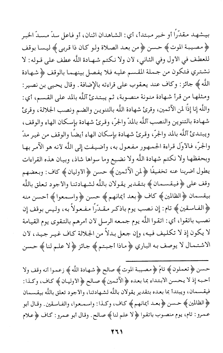 بيشهد مقدّرا أو خبر مبتدأ، أي: الشاهدان اثنان، أو فاعل سدّ مسدّ الخبر مُصِيبَةُ الْمَوْتِ حسن مِنْ بَعْدِ الصَّلاةِ ولَوْ كانَ ذا قُرْبى ليسا بوقف للعطف في الأول وفي الثاني، لأن ولا نكتم شهادة الله عطف على قوله: لا نشتري فتكون من جملة المقسم عليه فلا يفصل بينهما بالوقف شَهادَةَ اللَّهِ جائز: وكاف عند يعقوب على قراءته بالإضافة. وقال يحيى بن نصير: