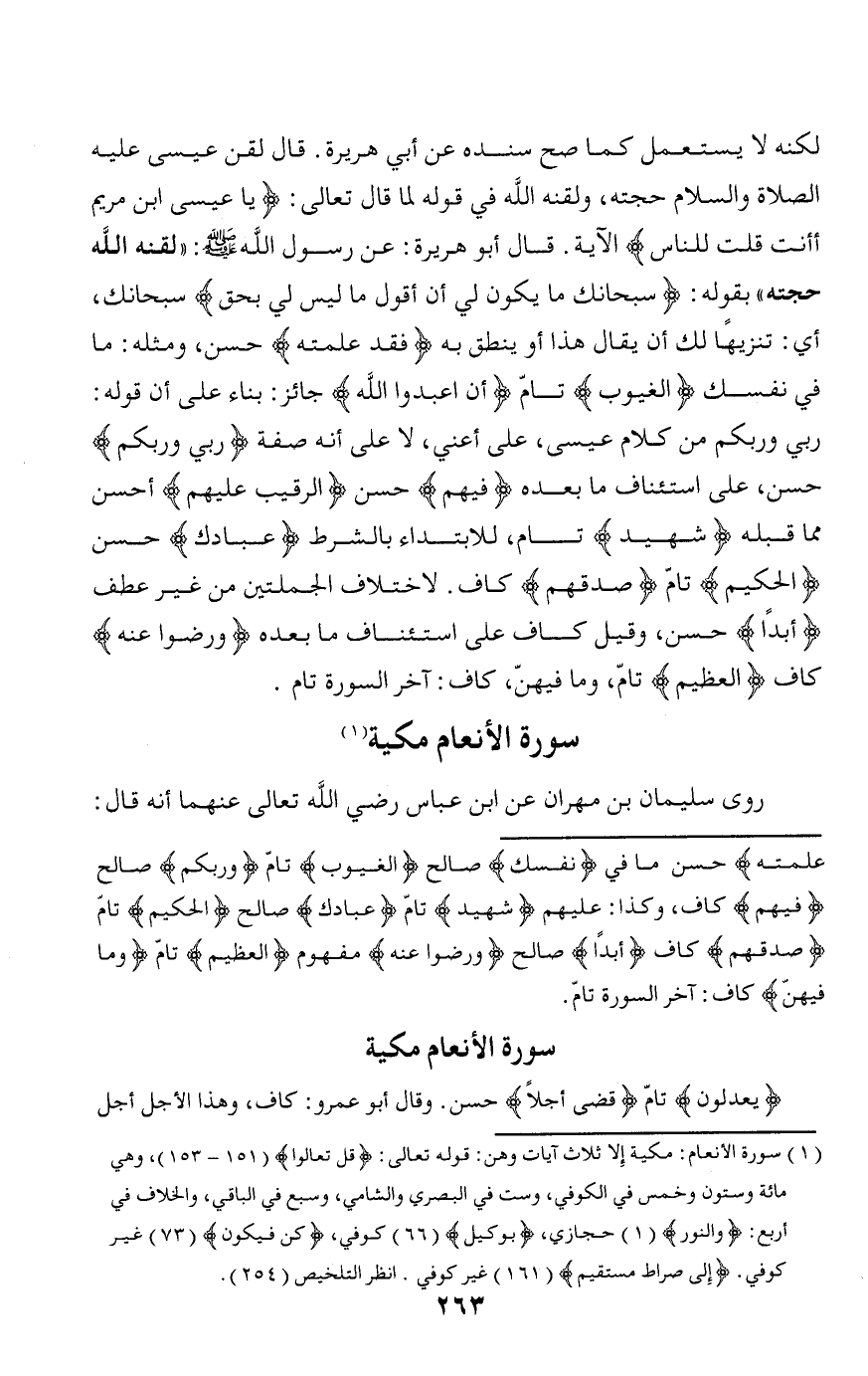 (¬1) سورة الأنعام: مكية إلا ثلاث آيات وهن: قوله تعالى: قُلْ تَعالَوْا (151 - 153)، وهي مائة وستون وخمس في الكوفي، وست في البصري والشامي، وسبع في الباقي، والخلاف في أربع: وَالنُّورَ (1) حجازي، بِوَكِيلٍ (66) كوفي، كُنْ فَيَكُونُ (73) غير كوفي. إِلى صِراطٍ مُسْتَقِيمٍ (161) غير كوفي. انظر التلخيص (254).