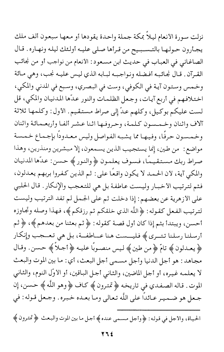 نزلت سورة الأنعام ليلا بمكة جملة واحدة يقودها أو معها سبعون ألف ملك يجأرون حولها بالتسبيح من قرأها صلّى عليه أولئك ليله ونهاره. قال الصاغاني في العباب في حديث ابن مسعود: الأنعام من نواجب أو من نجائب القرآن. قال نجائبه أفضله ونواجبه لبابه الذي ليس عليه نجب، وهي مائة وخمس وستون آية في الكوفي، وست في البصري، وسبع في المدني والمكي، اختلافهم في أربع آيات، وجعل الظلمات والنور عدّها المدنيان والمكي، قل لست عليكم بوكيل، وكلهم عدّ إلى صراط مستقيم. الأول: وكلمها ثلاثة آلاف واثنان وخمسون كلمة، وحروفها اثنا عشر ألفا وأربعمائة واثنان وخمسون حرفا، وفيها مما يشبه الفواصل وليس معدودا بإجماع خمسة مواضع: مِنْ طِينٍ، إِنَّما يَسْتَجِيبُ الَّذِينَ يَسْمَعُونَ، إِلَّا مُبَشِّرِينَ وَمُنْذِرِينَ، وَهذا صِراطُ رَبِّكَ مُسْتَقِيماً، فَسَوْفَ تَعْلَمُونَ. وَالنُّورَ حسن: عدّها المدنيان والمكي آية، لأن الحمد لا يكون واقعا على: ثم الذين كفروا بربهم يعدلون، فثم لترتيب الأخبار وليست عاطفة بل هي للتعجب والإنكار. قال الحلبي على الأزهرية عن بعضهم: إذا دخلت ثم على الجمل لم تفد الترتيب وليست لترتيب الفعل كقوله: اللَّهُ الَّذِي خَلَقَكُمْ ثُمَّ رَزَقَكُمْ، فهذا وصله وتجاوزه أحسن، ويبتدأ بثم إذا كان أول قصة كقوله: ثُمَّ بَعَثْنا مِنْ بَعْدِهِمْ*، ثُمَّ أَرْسَلْنا رُسُلَنا تَتْرا فليست هنا عاطفة، بل هي تعجب وإنكار يَعْدِلُونَ تامّ مِنْ طِينٍ ليس منصوبا عليه أَجَلًا حسن. وقال مجاهد: هو أجل الدنيا وأجل مسمى أجل البعث، أي: ما بين الموت والبعث لا يعلمه غيره، أو أجل الماضين، والثاني أجل الباقين، أو الأوّل النوم، والثاني الموت. قاله الصفدي في تاريخه تَمْتَرُونَ كاف وَهُوَ اللَّهُ حسن، إن جعل هو ضمير عائدا على الله تعالى وما بعده خبره. وجعل قوله: في