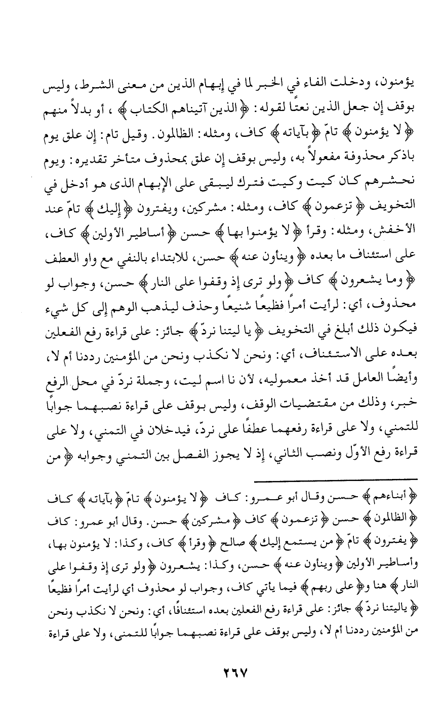 يؤمنون، ودخلت الفاء في الخبر لما في إبهام الذين من معنى الشرط، وليس بوقف إن جعل الذين نعتا لقوله: الَّذِينَ آتَيْناهُمُ الْكِتابَ، أو بدلا منهم لا يُؤْمِنُونَ تامّ بِآياتِهِ كاف، ومثله: الظالمون. وقيل تام: إن علق يوم باذكر محذوفة مفعولا به، وليس بوقف إن علق بمحذوف متأخر تقديره: ويوم نحشرهم كان كيت وكيت فترك ليبقى على الإبهام الذى هو أدخل في التخويف تَزْعُمُونَ كاف، ومثله: مشركين، ويفترون إِلَيْكَ تامّ عند الأخفش، ومثله: وقرأ لا يُؤْمِنُوا بِها حسن أَساطِيرُ الْأَوَّلِينَ كاف، على استئناف ما بعده وَيَنْأَوْنَ عَنْهُ حسن، للابتداء بالنفي مع واو العطف وَما يَشْعُرُونَ كاف وَلَوْ تَرى إِذْ وُقِفُوا عَلَى النَّارِ حسن، وجواب لو محذوف، أي: لرأيت أمرا فظيعا شنيعا وحذف ليذهب الوهم إلى كل شيء فيكون ذلك أبلغ في التخويف يا لَيْتَنا نُرَدُّ جائز: على قراءة رفع الفعلين بعده على الاستئناف، أي: ونحن لا نكذب ونحن من المؤمنين رددنا أم لا، وأيضا العامل قد أخذ معموليه، لأن نا اسم ليت، وجملة نردّ في محل الرفع خبر، وذلك من مقتضيات الوقف، وليس بوقف على قراءة نصبهما جوابا للتمني، ولا على قراءة رفعهما عطفا على نردّ، فيدخلان في التمني، ولا على قراءة رفع الأوّل ونصب الثاني، إذ لا يجوز الفصل بين التمني وجوابه مِنَ