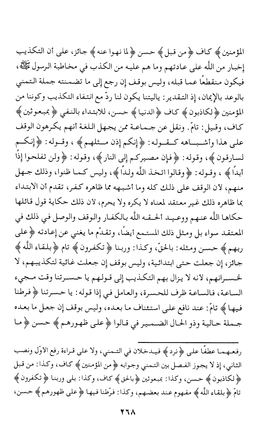 رفعهما عطفا على نُرَدُّ فيدخلان في التمني، ولا على قراءة رفع الأوّل ونصب الثاني، إذ لا يجوز الفصل بين التمني وجوابه مِنَ الْمُؤْمِنِينَ كاف، وكذا: من قبل لَكاذِبُونَ حسن، وكذا: بمبعوثين بِالْحَقِّ كاف، وكذا: بلى وربنا تَكْفُرُونَ تامّ بِلِقاءِ اللَّهِ مفهوم عند بعضهم، وكذا: فرّطنا فيها عَلى ظُهُورِهِمْ حسن،