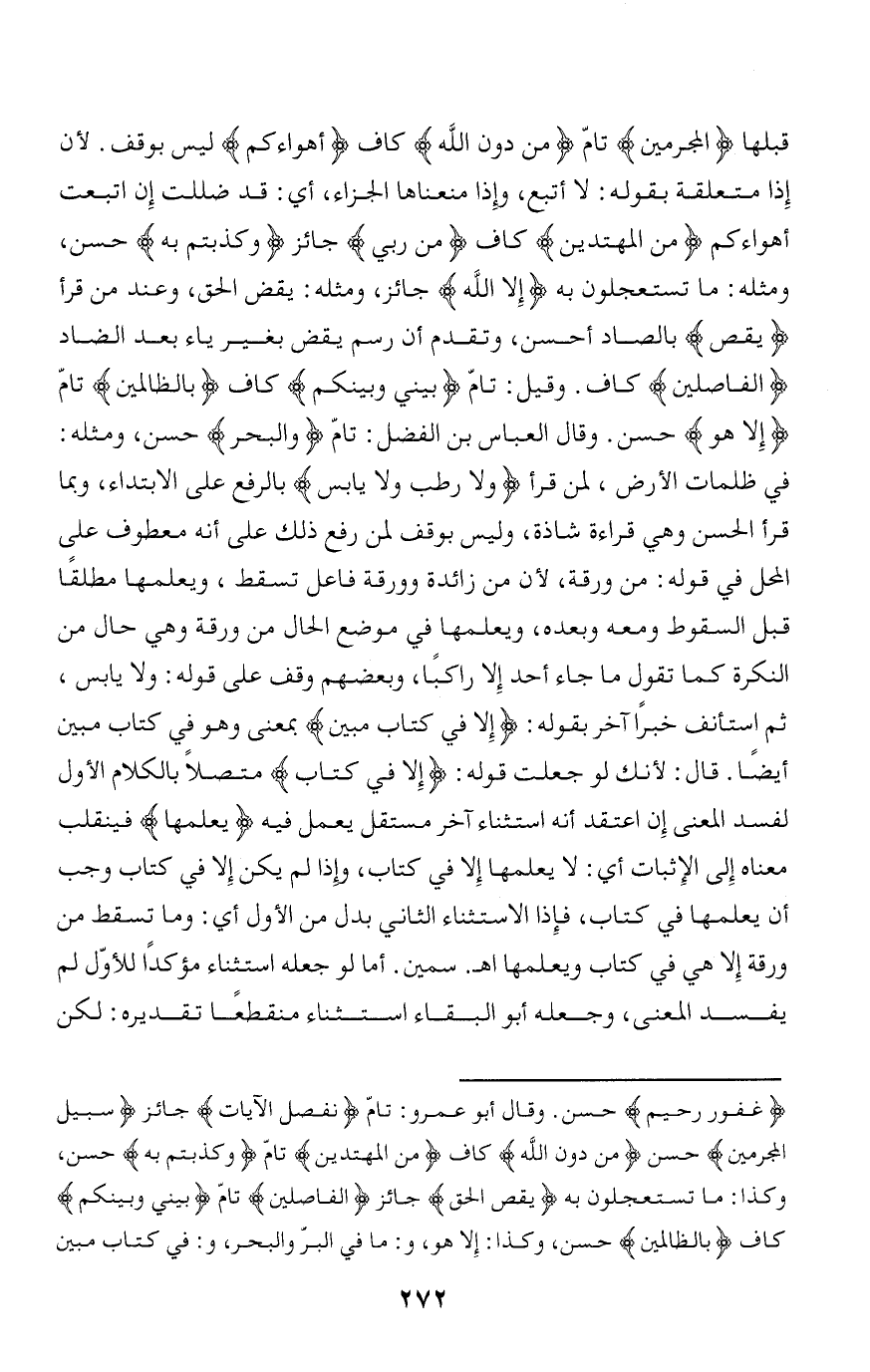 غَفُورٌ رَحِيمٌ حسن. وقال أبو عمرو: تامّ نُفَصِّلُ الْآياتِ جائز سَبِيلُ الْمُجْرِمِينَ حسن مِنْ دُونِ اللَّهِ كاف مِنَ الْمُهْتَدِينَ تامّ وَكَذَّبْتُمْ بِهِ حسن، وكذا: ما تستعجلون به يَقُصُّ الْحَقَّ جائز الْفاصِلِينَ تامّ بَيْنِي وَبَيْنَكُمْ كاف بِالظَّالِمِينَ حسن، وكذا: إِلَّا هُوَ، و: ما فِي الْبَرِّ وَالْبَحْرِ، و: فِي كِتابٍ مُبِينٍ