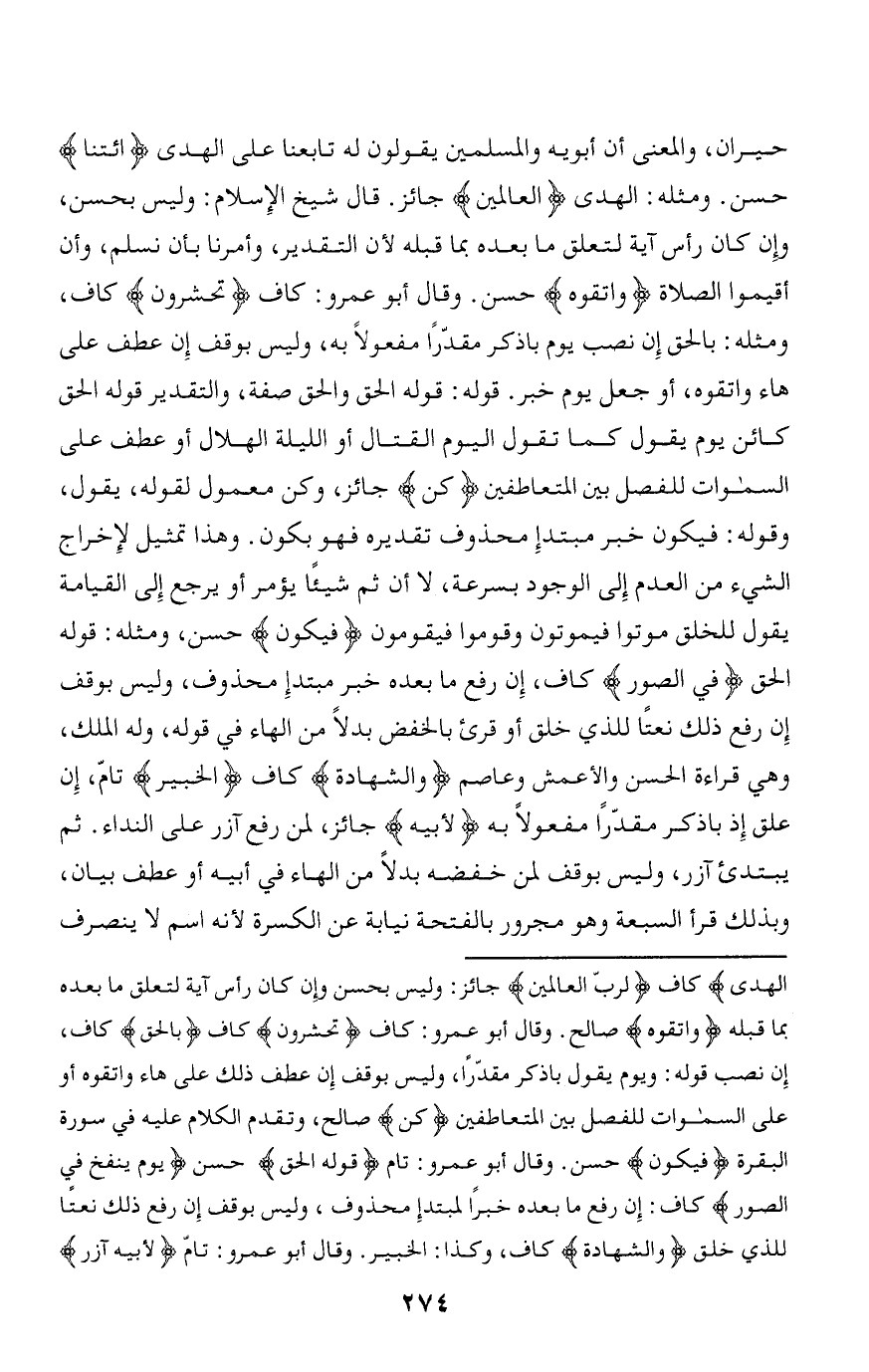 حيران، والمعنى أن أبويه والمسلمين يقولون له تابعنا على الهدى ائْتِنا حسن. ومثله: الهدى الْعالَمِينَ جائز. قال شيخ الإسلام: وليس بحسن، وإن كان رأس آية لتعلق ما بعده بما قبله لأن التقدير، وأمرنا بأن نسلم، وأن أقيموا الصلاة وَاتَّقُوهُ حسن. وقال أبو عمرو: كاف تُحْشَرُونَ كاف، ومثله: بالحق إن نصب يوم باذكر مقدّرا مفعولا به، وليس بوقف إن عطف على هاء واتقوه، أو جعل يوم خبر. قوله: قوله الحق والحق صفة، والتقدير قوله الحق كائن يوم يقول كما تقول اليوم القتال أو الليلة الهلال أو عطف على السموات للفصل بين المتعاطفين كُنْ جائز، وكن معمول لقوله، يقول، وقوله: فيكون خبر مبتدإ محذوف تقديره فهو بكون. وهذا تمثيل لإخراج الشيء من العدم إلى الوجود بسرعة، لا أن ثم شيئا يؤمر أو يرجع إلى القيامة يقول للخلق موتوا فيموتون وقوموا فيقومون فَيَكُونُ حسن، ومثله: قوله الحق فِي الصُّورِ كاف، إن رفع ما بعده خبر مبتدإ محذوف، وليس بوقف إن رفع ذلك نعتا للذي خلق أو قرئ بالخفض بدلا من الهاء في قوله، وله الملك، وهي قراءة الحسن والأعمش وعاصم وَالشَّهادَةِ كاف الْخَبِيرُ تامّ، إن علق إذ باذكر مقدّرا مفعولا به لِأَبِيهِ جائز، لمن رفع آزر على النداء. ثم يبتدئ آزر، وليس بوقف لمن خفضه بدلا من الهاء في أبيه أو عطف بيان، وبذلك قرأ السبعة وهو مجرور بالفتحة نيابة عن الكسرة لأنه اسم لا ينصرف