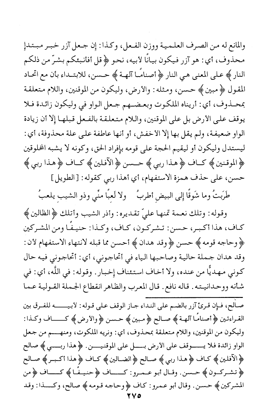 والمانع له من الصرف العلمية ووزن الفعل، وكذا: إن جعل آزر خبر مبتدإ محذوف، أي: هو آزر فيكون بيانا لأبيه، نحو قُلْ أَفَأُنَبِّئُكُمْ بِشَرٍّ مِنْ ذلِكُمُ النَّارُ على المعنى هي النار أَصْناماً آلِهَةً حسن، للابتداء بأن مع اتحاد المقول مُبِينٍ حسن، ومثله: والأرض، وليكون من الموقنين، واللام متعلقة بمحذوف، أي: أريناه الملكوت وبعضهم جعل الواو في وليكون زائدة فلا يوقف على الأرض بل على الموقنين، واللام متعلقة بالفعل قبلها إلا أن زيادة الواو ضعيفة، ولم يقل بها إلا الأخفش، أو أنها عاطفة على علة محذوفة، أي:
