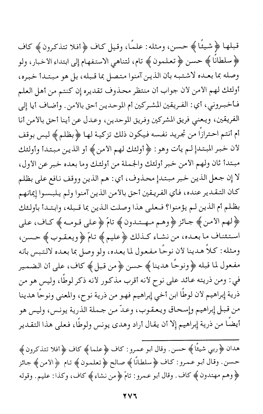 قبلها شَيْئاً حسن، ومثله: علما، وقيل كاف أَفَلا تَتَذَكَّرُونَ كاف سُلْطاناً حسن تَعْلَمُونَ تام، لتناهي الاستفهام إلى ابتداء الأخبار، ولو وصله بما بعده لاشتبه بأن الذين آمنوا متصل بما قبله، بل هو مبتدأ خبره، أولئك لهم الأمن لأن جواب أن منتظر محذوف تقديره إن كنتم من أهل العلم فأخبروني، أي: الفريقين المشركين أم الموحدين أحق بالأمن. وأضاف أيا إلى الفريقين، ويعني فريق المشركين وفريق الموحدين، وعدل عن أينا أحق بالأمن أنا أم أنتم احترازا من تجريد نفسه فيكون ذلك تزكية لها بِظُلْمٍ ليس بوقف لأن خبر المبتدإ لم يأت وهو: أُولئِكَ لَهُمُ الْأَمْنُ أو الذين مبتدأ وأولئك مبتدأ ثان ولهم الأمن خبر أولئك والجملة من أولئك وما بعده خبر عن الأول، لا إن جعل الذين خبر مبتدإ محذوف، أي: هم الذين ووقف نافع على بظلم كان التقدير عنده، فأي الفريقين أحق بالأمن الذين آمنوا ولم يلبسوا إيمانهم بظلم أم الذين لم يؤمنوا؟ فعلى هذا وصلت الذين بما قبله، وابتدأ بأولئك لَهُمُ الْأَمْنُ جائز وَهُمْ مُهْتَدُونَ تامّ عَلى قَوْمِهِ كاف، على استئناف ما بعده، من نشاء كذلك عَلِيمٌ تامّ وَيَعْقُوبَ حسن، ومثله: كلا هدينا لأن نوحا مفعول لما بعده، ولو وصل بما بعده لالتبس بأنه مفعول لما قبله وَنُوحاً هَدَيْنا حسن مِنْ قَبْلُ كاف، على أن الضمير في: ومن ذريته عائد على نوح لأنه أقرب مذكور لأنه ذكر لوطا، وليس هو من ذرية إبراهيم لأن لوطا ابن أخي إبراهيم فهو من ذرية نوح، والمعنى ونوحا هدينا من قبل إبراهيم وإسحاق ويعقوب، وعدّ من جملة الذرية يونس، وليس هو أيضا من ذرية إبراهيم إلا أن يقال أراد وهدى يونس ولوطا، فعلى هذا التقدير