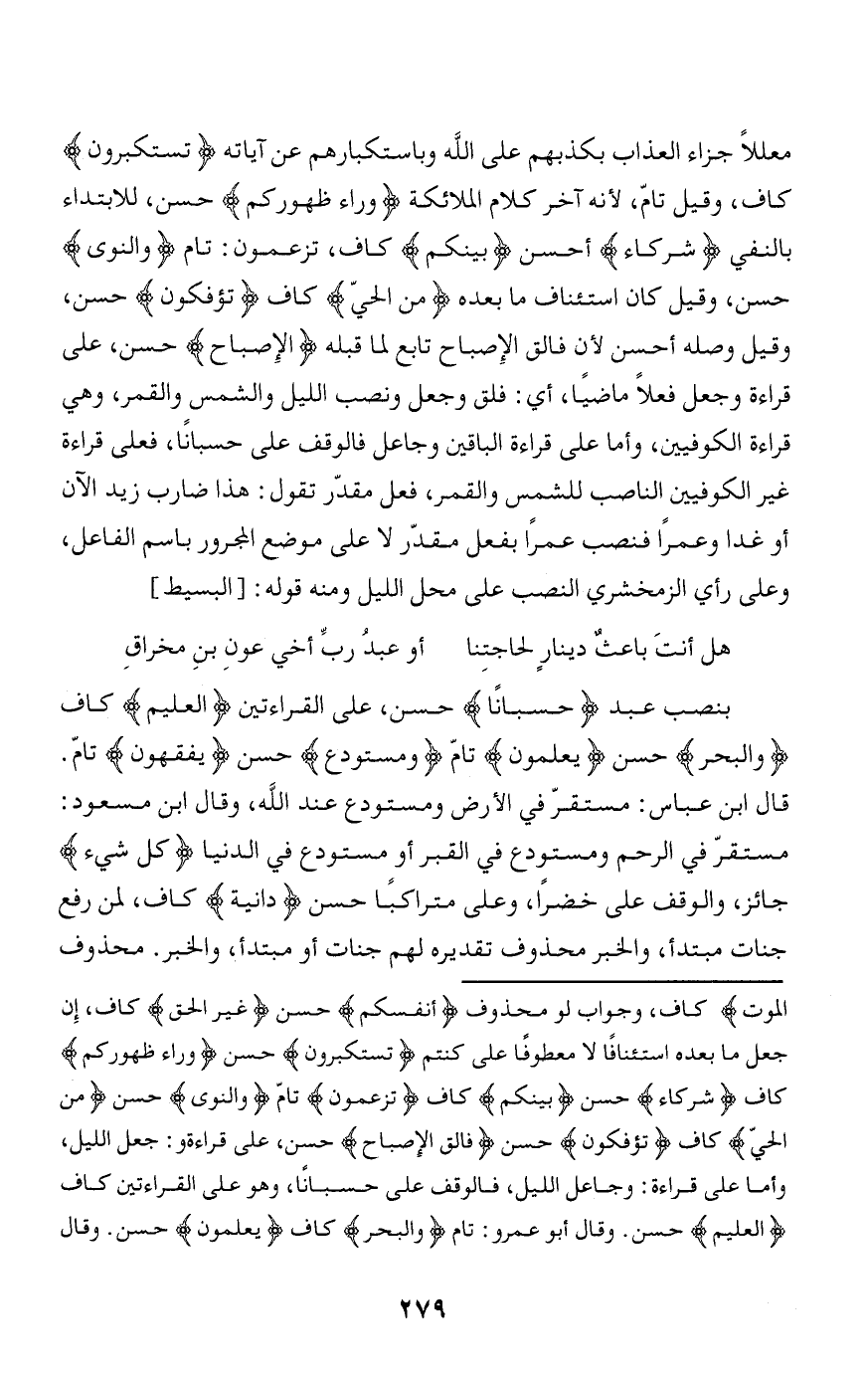 معللا جزاء العذاب بكذبهم على الله وباستكبارهم عن آياته تَسْتَكْبِرُونَ كاف، وقيل تامّ، لأنه آخر كلام الملائكة وَراءَ ظُهُورِكُمْ حسن، للابتداء بالنفي شُرَكاءُ أحسن بَيْنَكُمْ كاف، تَزْعُمُونَ: تام وَالنَّوى حسن، وقيل كان استئناف ما بعده مِنَ الْحَيِّ كاف تُؤْفَكُونَ حسن، وقيل وصله أحسن لأن فالق الإصباح تابع لما قبله الْإِصْباحِ حسن، على قراءة وجعل فعلا ماضيا، أي: فلق وجعل ونصب الليل والشمس والقمر، وهي قراءة الكوفيين، وأما على قراءة الباقين وجاعل فالوقف على حسبانا، فعلى قراءة غير الكوفيين الناصب للشمس والقمر، فعل مقدّر تقول: هذا ضارب زيد الآن أو غدا وعمرا فنصب عمرا بفعل مقدّر لا على موضع المجرور باسم الفاعل، وعلى رأي الزمخشري النصب على محل الليل ومنه قوله: [البسيط]
